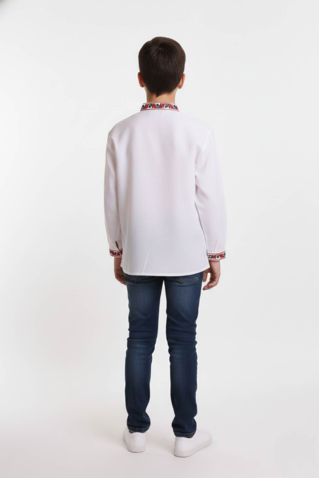 Camasa traditionala de baieti alba din bumbac cu maneca lunga si motiv traditional rosu
