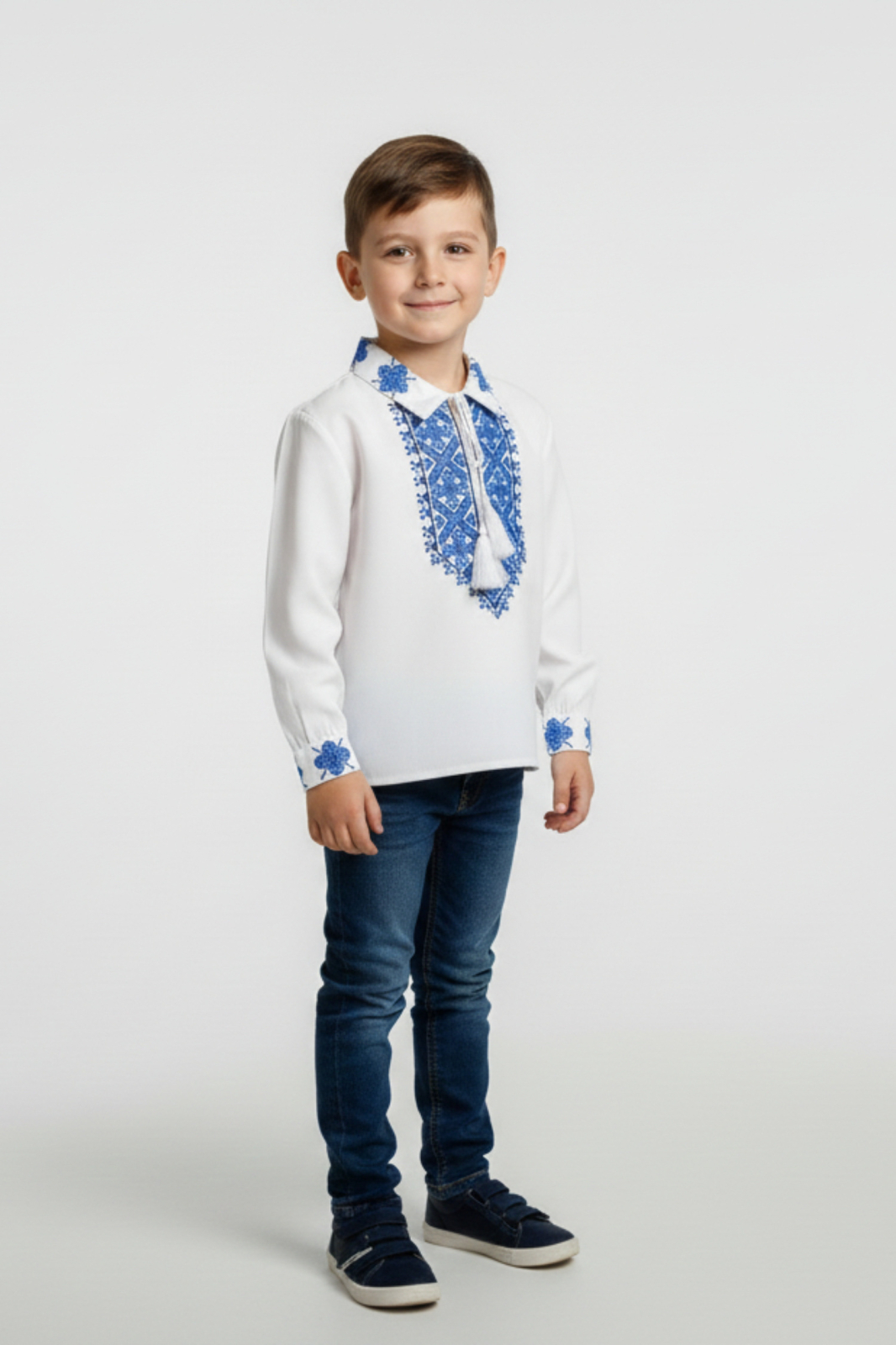 Camasa traditionala de baieti din bumbac alb, cu broderie albastra si croi lejer, ideala pentru serbari si evenimente speciale.
