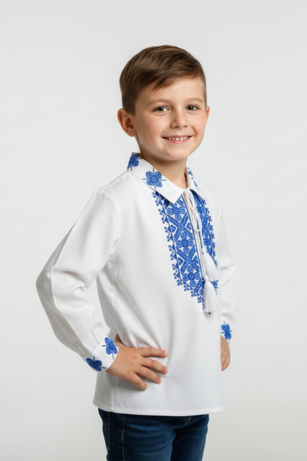 Camasa traditionala de baieti alba, din bumbac, decorata cu broderie albastra pe piept, guler si mansete. Croiala lejera cu maneci lungi si guler cu snur asigura confort si libertate de miscare, fiind ideala pentru serbari scolare, petreceri tematice sau ocazii speciale.