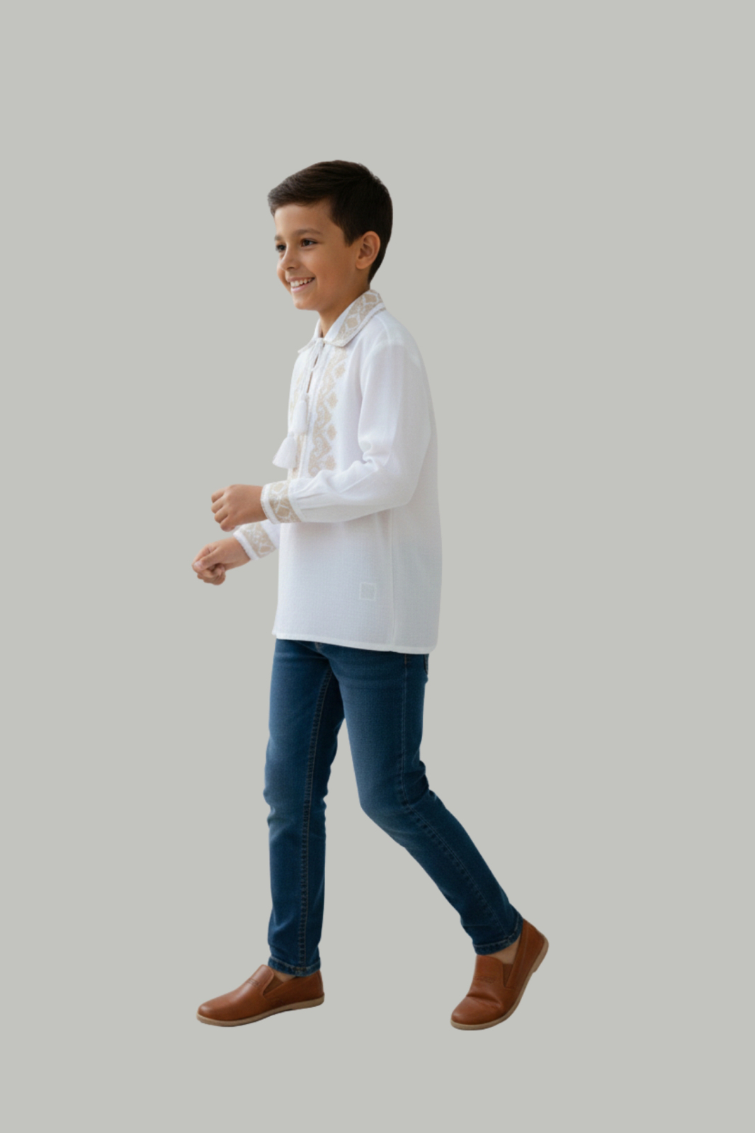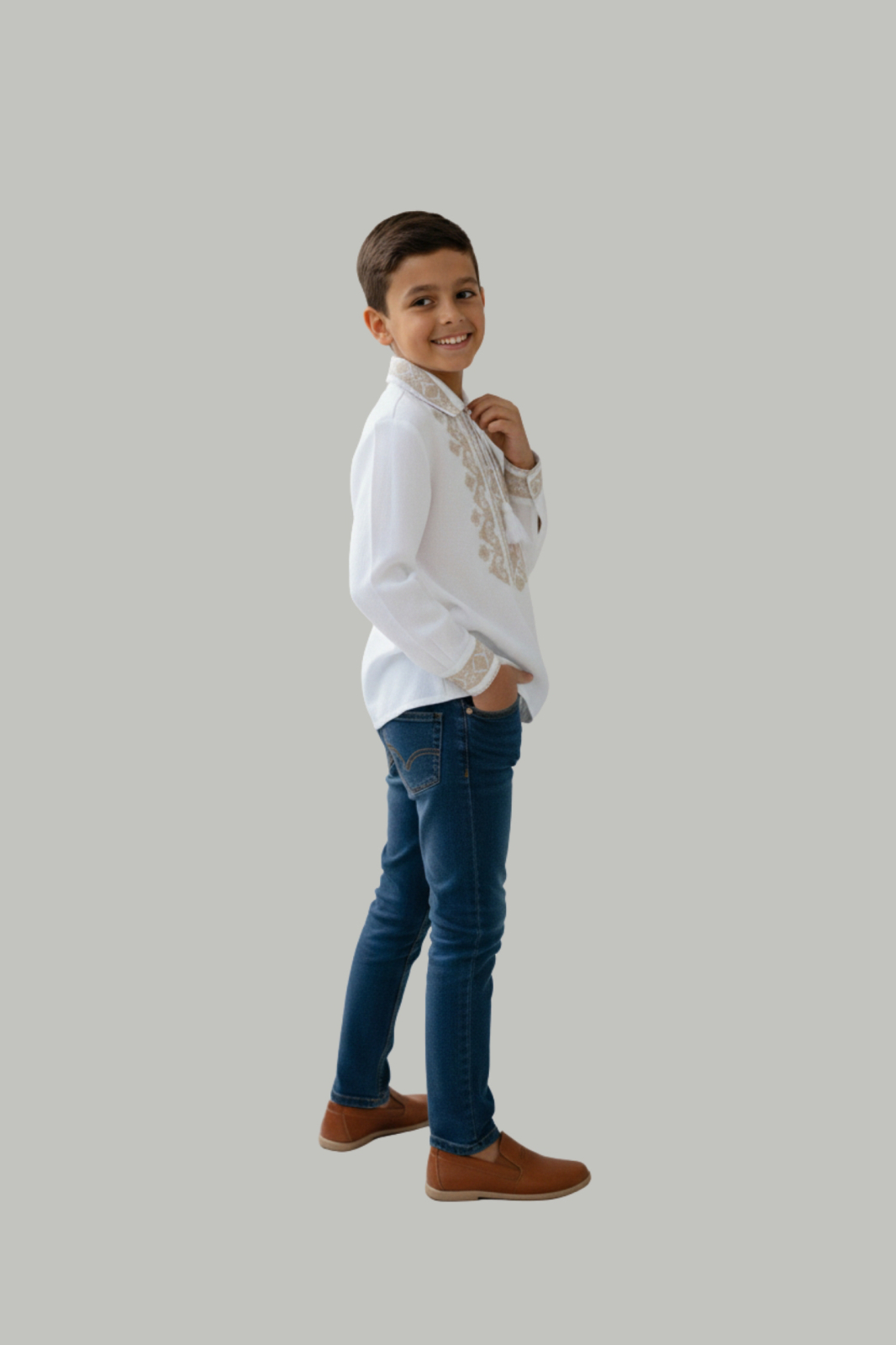 Camasa traditionala alba din bumbac cu maneca lunga si motiv traditional crem