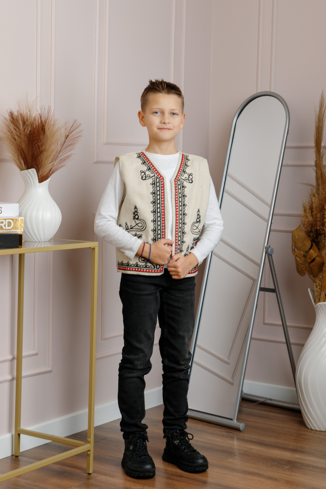 Vesta traditionala pentru baieti este confectionata din stofa (lana), oferind confort si lejeritate la purtare. Designul fara inchidere permite imbracarea usoara si libertate de miscare, fiind potrivit pentru copii activi.