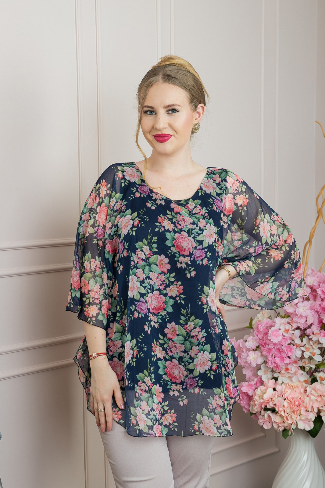 Aceasta bluza din voal cu imprimeu floral vibrant in nuante de verde, roz, lila si alb este ideala pentru a adauga un strop de culoare garderobei. Designul vaporos si croiala lejera avantajeaza orice tip de silueta si mascheaza micile imperfectiuni ale corpului. Manecile tip fluture si materialul usor ofera un confort sporit, fiind perfecta pentru zilele calde de vara. Poate fi asortata cu pantaloni simpli pentru un look elegant si rafinat sau cu jeans pentru un stil casual si relaxat.