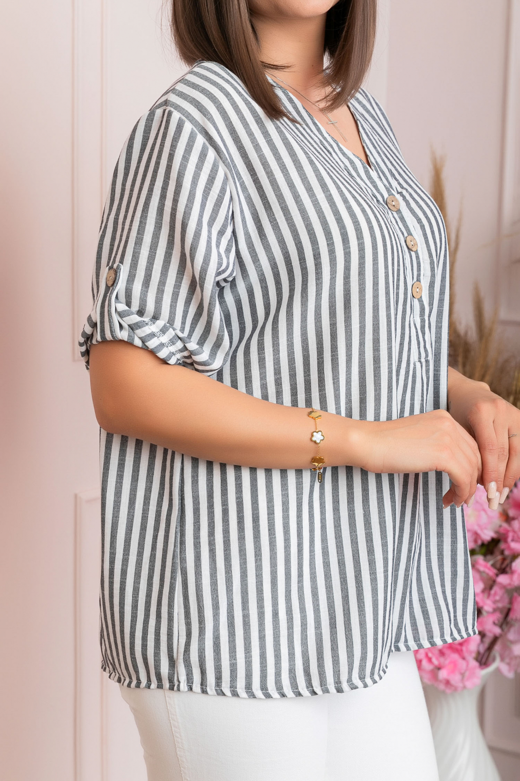Bluza Freya este piesa perfecta pentru garderoba de primavara‑vara, combinand lejeritatea materialului tip in cu un design modern, in dungi verticale subtiri gri antracit si albe care subtiaza optic silueta. Croiala lejera si tivul usor rotunjit permit libertate de miscare si o aerisire placuta in zilele calde, iar decolteul in V este accentuat de trei nasturi functionali material ce imita lemnul, ideali pentru ajustarea deschiderii dupa preferinte. Manecile pot fi purtate fie trei sferturi, fie suflecate si fixate cu nasture, oferind versatilitate intre un look casual de zi si unul smart‑casual. Materialul este opac si nu necesita dublura la interior, asigurand confort fara transparenta, in timp ce textura usor creponata mascheaza micile cute si confera un aspect natural, vaporos. Recomandata atat cu jeansi, cat si cu pantaloni conici sau fuste midi, aceasta bluza este o alegere potrivita pentru tinute de birou, plimbari in oras sau vacante la mare.