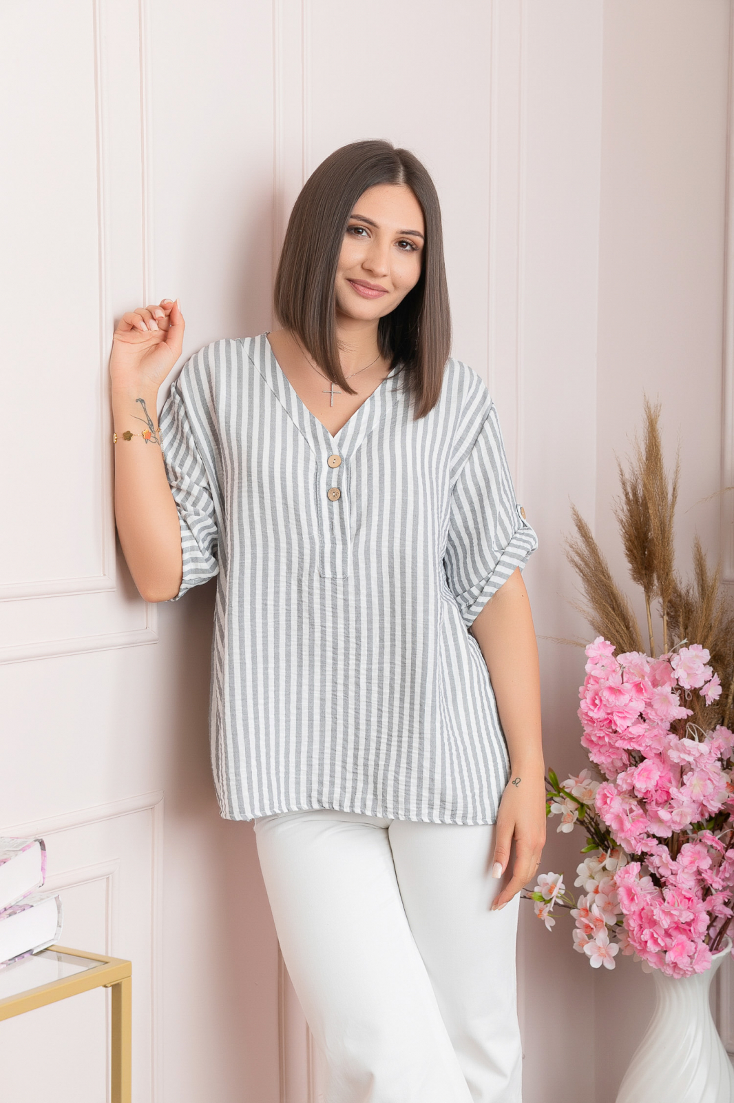Bluza Freya este piesa perfecta pentru garderoba de primavara‑vara, combinand lejeritatea materialului tip in cu un design modern, in dungi verticale subtiri gri si albe care subtiaza optic silueta. Croiala lejera si tivul usor rotunjit permit libertate de miscare si o aerisire placuta in zilele calde, iar decolteul in V este accentuat de trei nasturi functionali material ce imita lemnul, ideali pentru ajustarea deschiderii dupa preferinte. Manecile pot fi purtate fie trei sferturi, fie suflecate si fixate cu nasture, oferind versatilitate intre un look casual de zi si unul smart‑casual. Materialul este opac si nu necesita dublura la interior, asigurand confort fara transparenta, in timp ce textura usor creponata mascheaza micile cute si confera un aspect natural, vaporos. Recomandata atat cu jeansi, cat si cu pantaloni conici sau fuste midi, aceasta bluza este o alegere potrivita pentru tinute de birou, plimbari in oras sau vacante la mare.