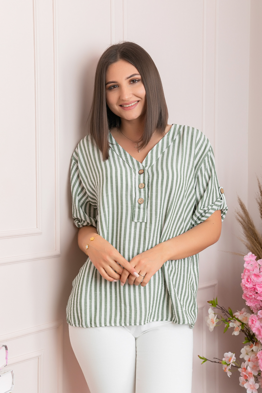Bluza Freya este piesa perfecta pentru garderoba de primavara‑vara, combinand lejeritatea materialului tip in cu un design modern, in dungi verticale subtiri verzi si albe care subtiaza optic silueta. Croiala lejera si tivul usor rotunjit permit libertate de miscare si o aerisire placuta in zilele calde, iar decolteul in V este accentuat de trei nasturi functionali material ce imita lemnul, ideali pentru ajustarea deschiderii dupa preferinte. Manecile pot fi purtate fie trei sferturi, fie suflecate si fixate cu nasture, oferind versatilitate intre un look casual de zi si unul smart‑casual. Materialul este opac si nu necesita dublura la interior, asigurand confort fara transparenta, in timp ce textura usor creponata mascheaza micile cute si confera un aspect natural, vaporos. Recomandata atat cu jeansi, cat si cu pantaloni conici sau fuste midi, aceasta bluza este o alegere potrivita pentru tinute de birou, plimbari in oras sau vacante la mare.