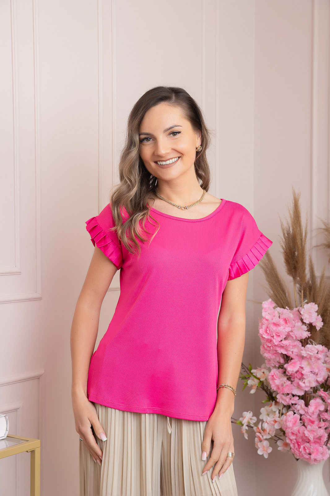 Bluza eleganta Aurora este piesa ce completeaza instant orice tinuta office sau smart-casual, datorita volanelor plisate care contureaza delicat linia umerilor. Confectionata din jersey fin, usor elastic, cu textura subtire tip rib, bluza se aseaza impecabil pe corp, oferind libertate de miscare si confort pe parcursul intregii zile. Croiala lejera, cu lungime medie, acopera talia exact atat cat trebuie pentru a flata orice silueta, iar decolteul rotund clasic permite accesorizarea rapida cu coliere statement. Lipsa sistemelor de inchidere face imbracarea rapida si simpla, iar materialul dens reduce transparenta, astfel incat poate fi purtata atat direct pe piele, cat si sub sacouri sau cardigane. Bluza se potriveste perfect cu fuste conice, pantaloni eleganti sau jeansi, fiind ideala pentru birou, evenimente de zi sau iesiri in oras.