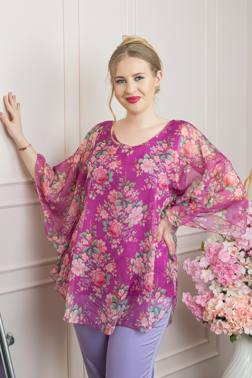 Aceasta bluza din voal cu imprimeu floral vibrant in nuante de roz, galben, alb si verde este ideala pentru a adauga un strop de culoare garderobei. Designul vaporos si croiala lejera avantajeaza orice tip de silueta si mascheaza micile imperfectiuni ale corpului. Manecile tip fluture si materialul usor ofera un confort sporit, fiind perfecta pentru zilele calde de vara. Poate fi asortata cu pantaloni simpli pentru un look elegant si rafinat sau cu jeans pentru un stil casual si relaxat.