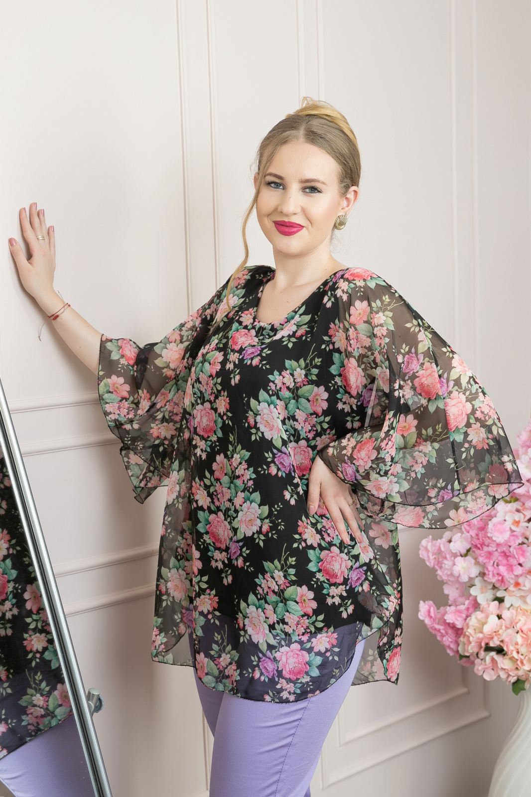 Bluza neagra din voal cu imprimeu floral si maneci fluture