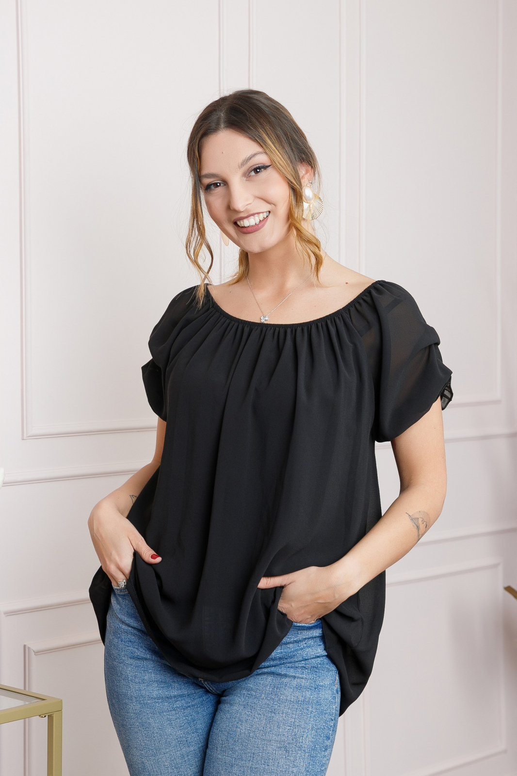 Acest model de bluza poate fi purtat atat cu pantaloni, cat si cu fusta. Materialul vaporos este ideal pentru sezonul calduros, ofera lejeritate in miscare si mascheaza micile imperfectiuni ale corpului.