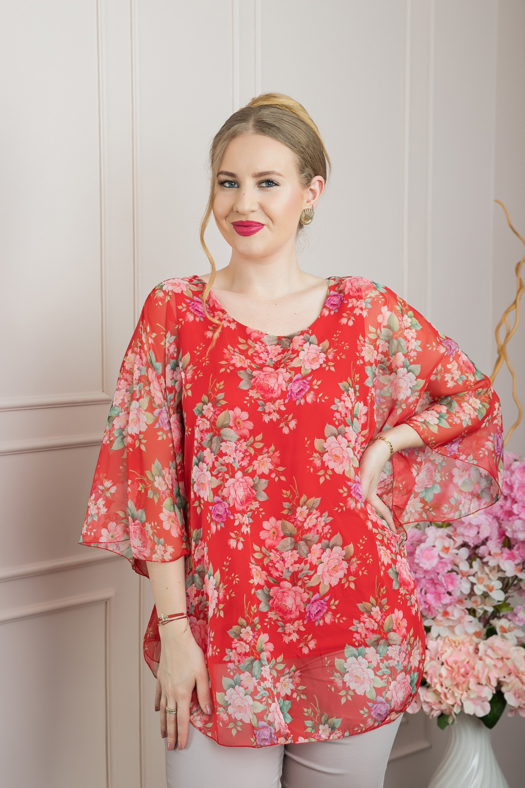 Aceasta bluza din voal cu imprimeu floral vibrant in nuante de roz, mov si verde este ideala pentru a adauga un strop de culoare garderobei. Designul vaporos si croiala lejera avantajeaza orice tip de silueta si mascheaza micile imperfectiuni ale corpului. Manecile tip fluture si materialul usor ofera un confort sporit, fiind perfecta pentru zilele calde de vara. Poate fi asortata cu pantaloni simpli pentru un look elegant si rafinat sau cu jeans pentru un stil casual si relaxat.