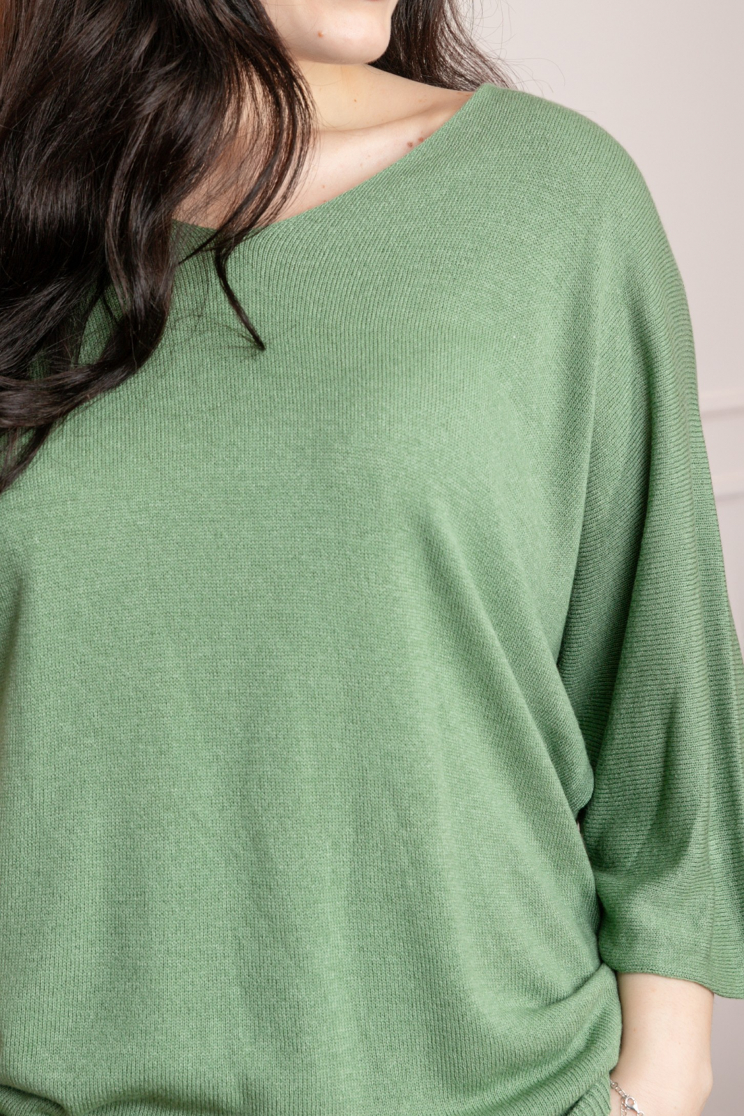 Bluza fina din tricot subtire. Are decolteu in V, croi lejer si maneci trei sferturi.