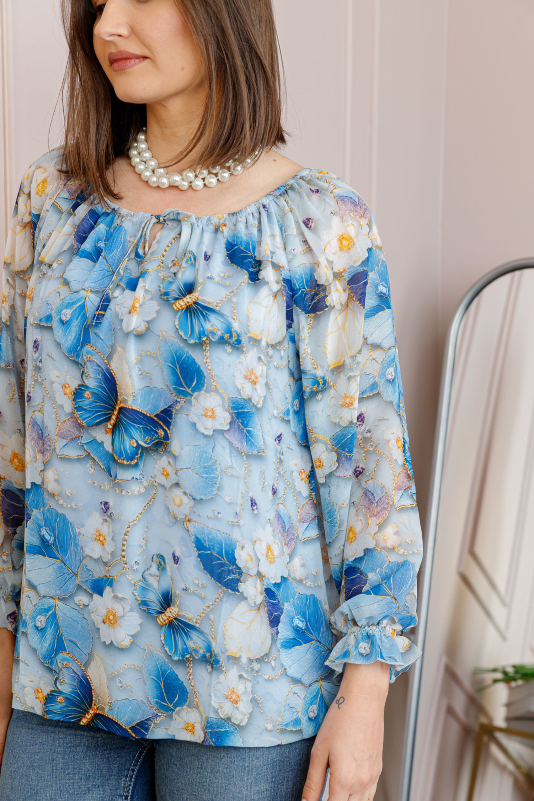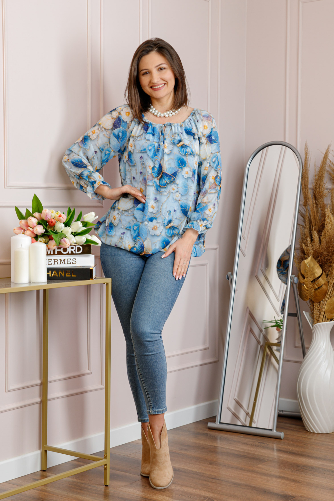 Bluza bleu cu imprimeu delicat cu fluturi albastru regal, din material vaporos tip voal, cu maneci lungi lejere si captuseala interioara pentru confort.