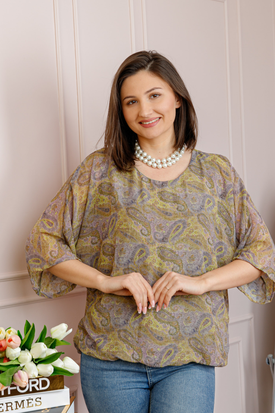 Bluza dama din voal cu captuseala interioara, imprimeu floral verde olive si maneci vaporoase. O piesa eleganta si lejera, perfecta pentru tinute feminine de zi.