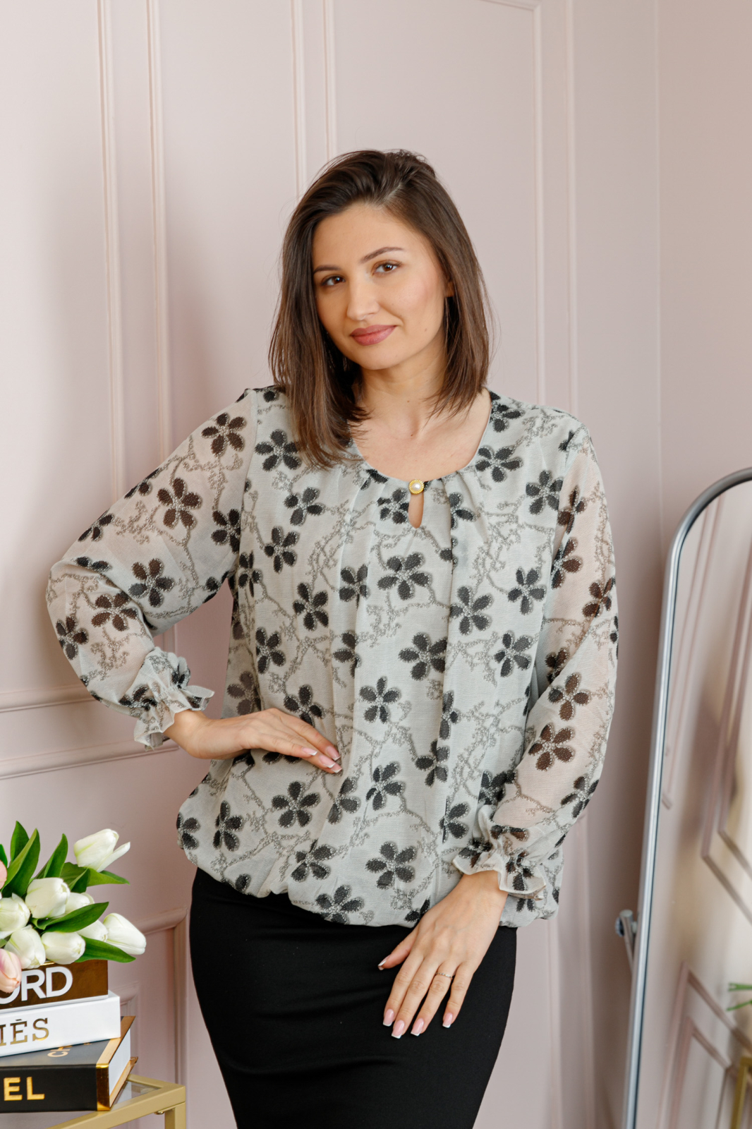 Bluza dama Pauline din voal gri cu imprimeu floral negru