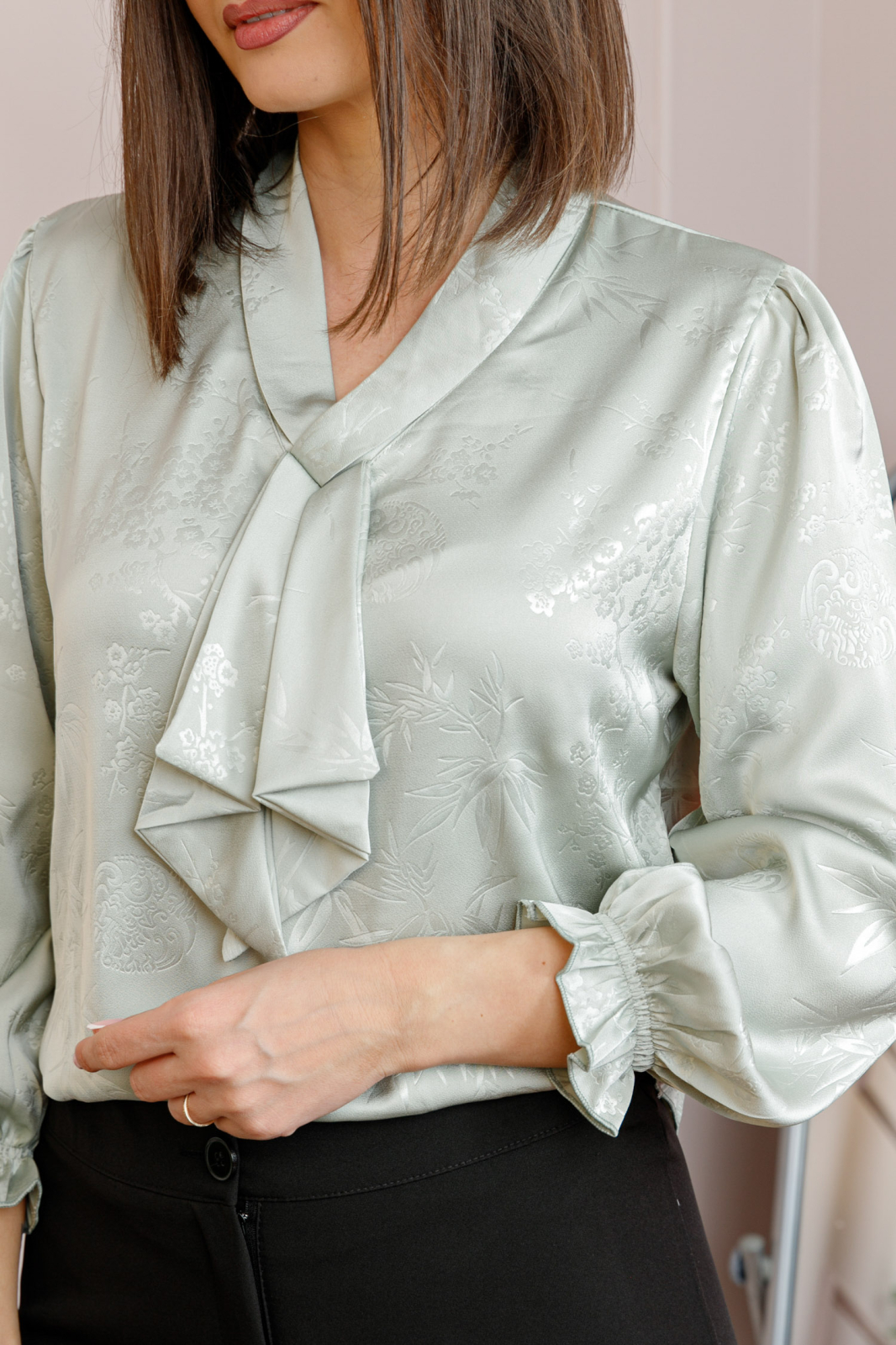 Bluza dama satinata verde pastel, cu aplicatie tip cravata si model floral discret. Eleganta, confortabila si usor de integrat in tinute office sau elegante.