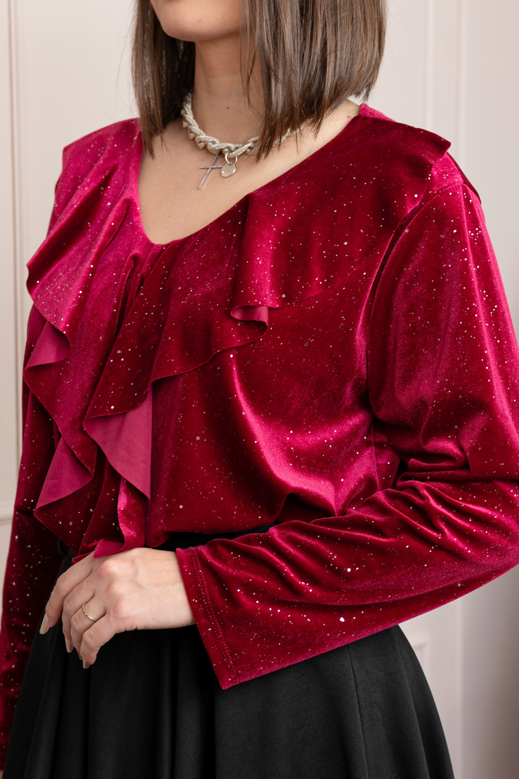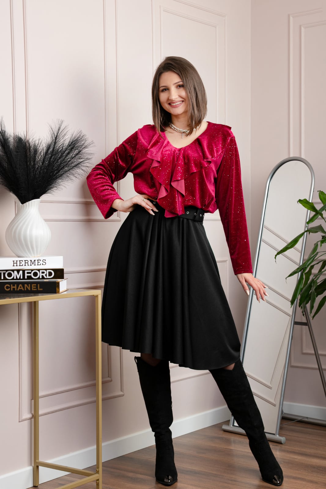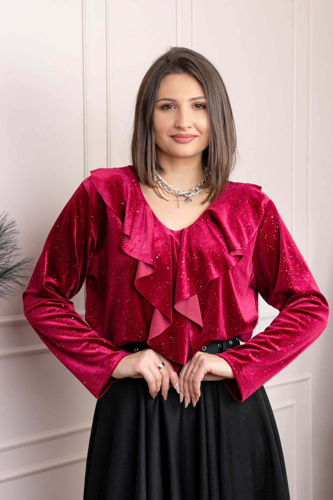 Bluza Cynthia este o piesa rafinata, perfecta pentru momentele in care vrei sa stralucesti cu eleganta. Realizata dintr-un amestec fin de materiale (50% acrilic, 25% viscoza, 20% poliester, 5% elastan), catifeaua moale si fluida se aseaza frumos pe silueta, oferind confort si stralucire subtila datorita sclipiciului fin integrat in tesatura.