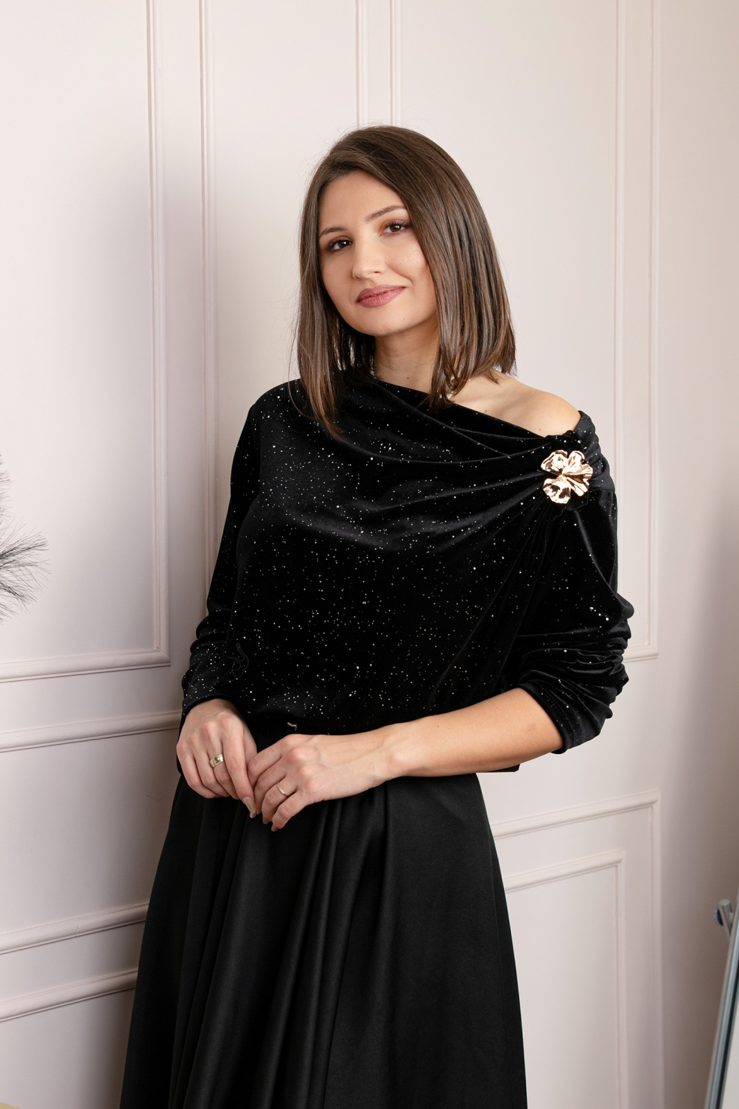 Designul versatil permite purtarea bluzei atat in stil clasic, cat si usor cazuta pe un umar, pentru un efect senzual si modern. Brosa aurie cu accente festive adauga un detaliu spectaculos, iar sclipiciul discret integrat in material ofera un plus de stralucire.
