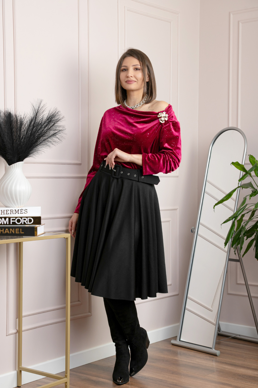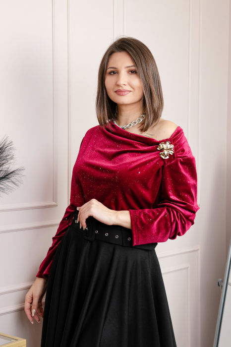 Designul versatil permite purtarea bluzei atat in stil clasic, cat si usor cazuta pe un umar, pentru un efect senzual si modern. Brosa aurie cu accente festive adauga un detaliu spectaculos, iar sclipiciul discret integrat in material ofera un plus de stralucire.