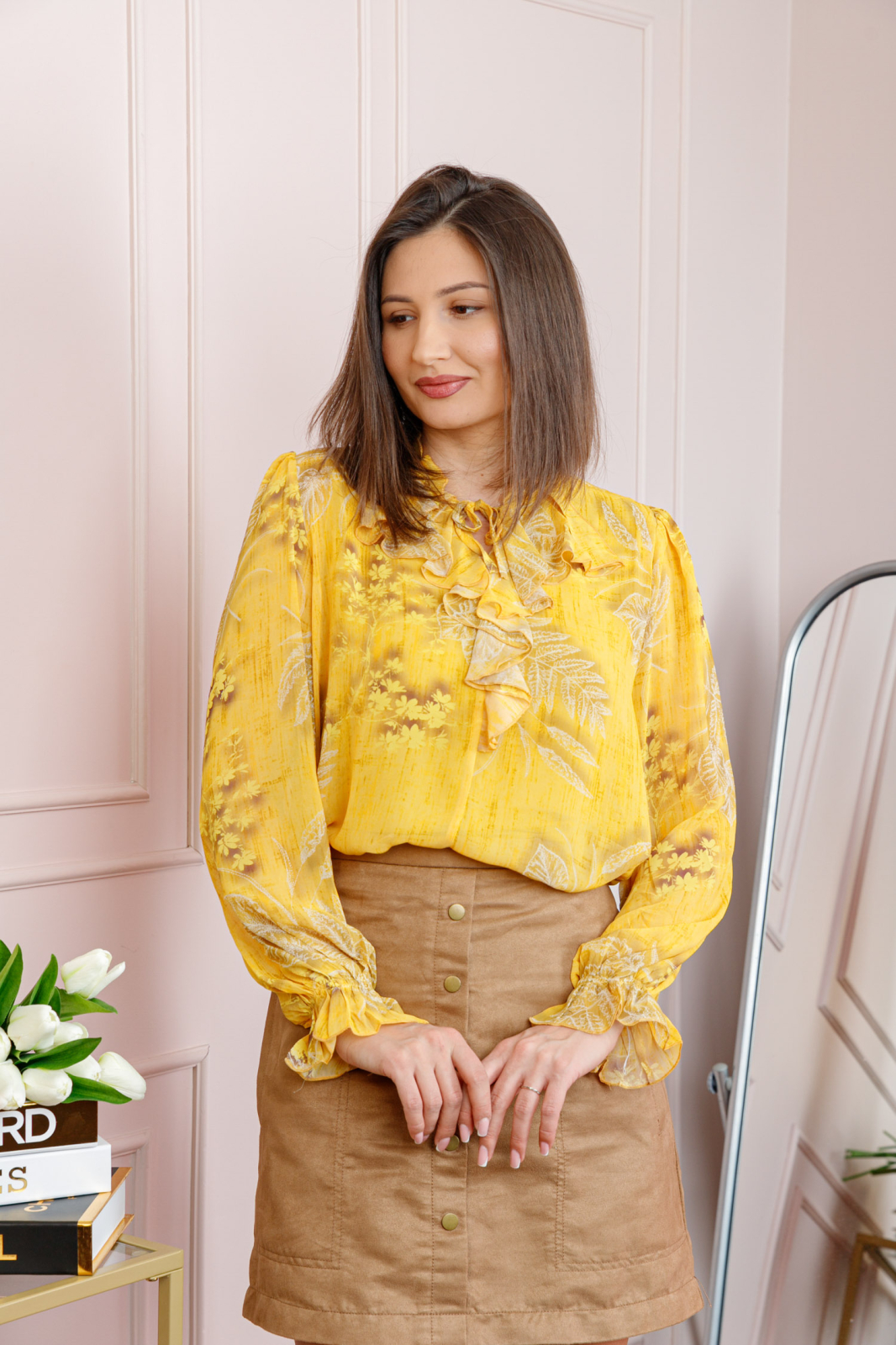 Bluza eleganta Lucienne imbina delicatetea materialelor vaporoase cu un design feminin si sofisticat. Imprimeul floral in nuante de alb pe fundal galben creeaza un contrast elegant, perfect pentru tinute de zi sau de seara.