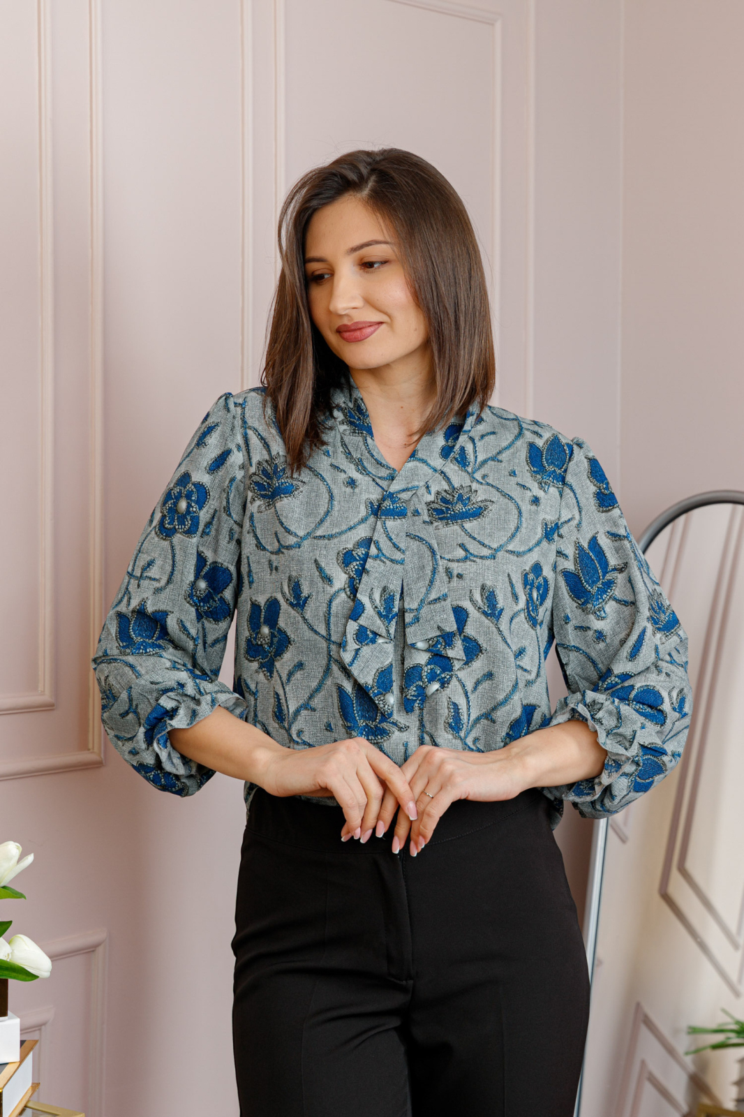 Imprimeul floral in nuante de gri melanj si albastru regal adauga un plus de rafinament si personalitate tinutei, transformand bluza intr-o piesa usor de remarcat.