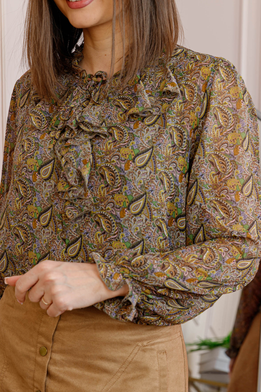 Bluza eleganta Lucienne imbina delicatetea materialelor vaporoase cu un design feminin si sofisticat. Imprimeul in nuante de maro pe fundal verde olive creeaza un contrast elegant, perfect pentru tinute de zi sau de seara.