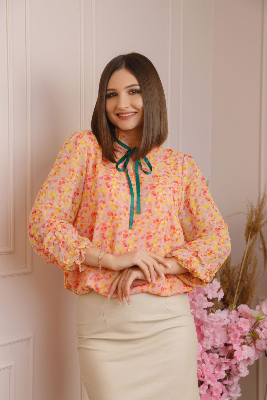 Realizata din voal fin si vaporos, aceasta bluza are un imprimeu in nuante de corai si galben si maneci lungi bufante cu elastic si volanas la baza, care ofera un plus de feminitate si libertate de miscare. Gulerul este prevazut cu un snur reglabil si volanase delicate, adaugand o nota romantica tinutei tale. Croiul lejer asigura confort pe tot parcursul zilei, iar designul elegant se potriveste atat cu fuste, cat si cu pantaloni. Acest model de bluza vaporoasa este perfect pentru un look sofisticat si versatil, perfect pentru sezonul de primavara. Modelul din imagine are 174 cm inaltime si poarta marimea M.