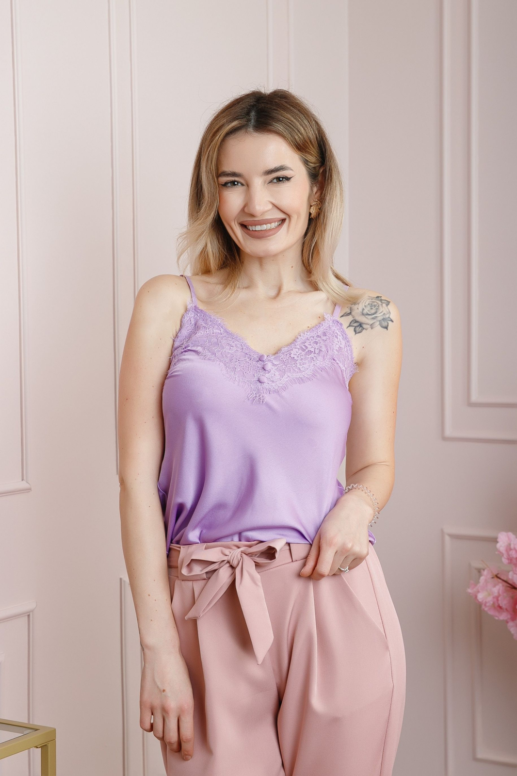 Top elegant lila cu aplicatie din dantela pe bust, decolteu in V si bretele reglabile.