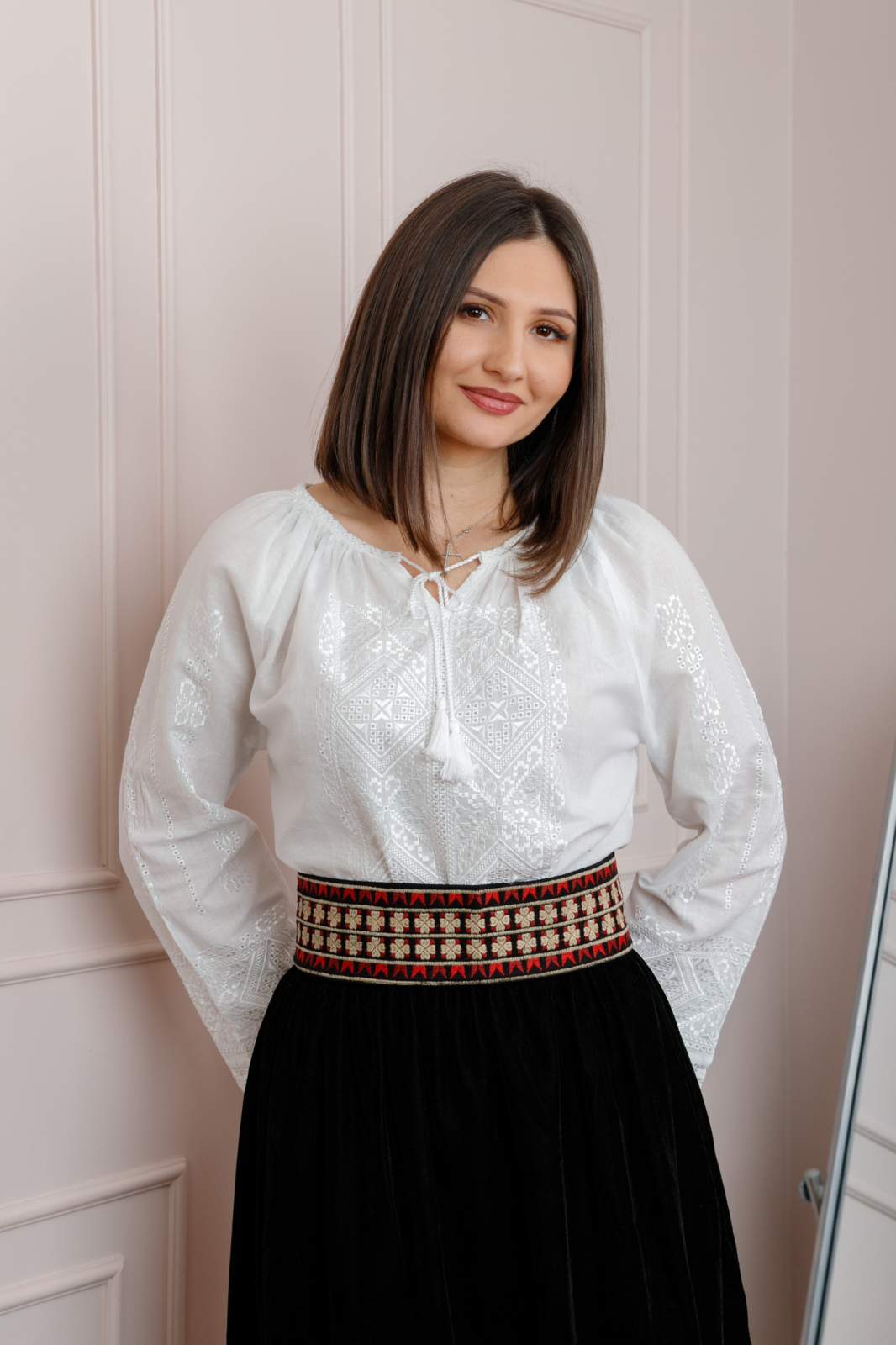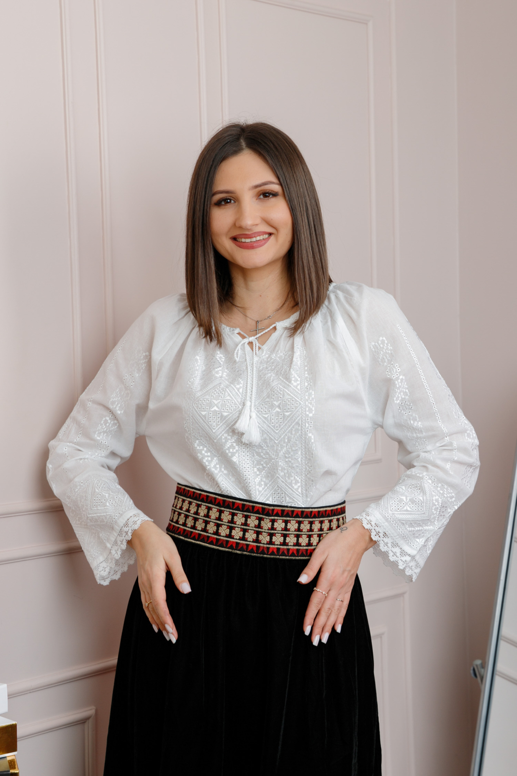Brau traditional negru din bumbac cu motiv floral crem.
