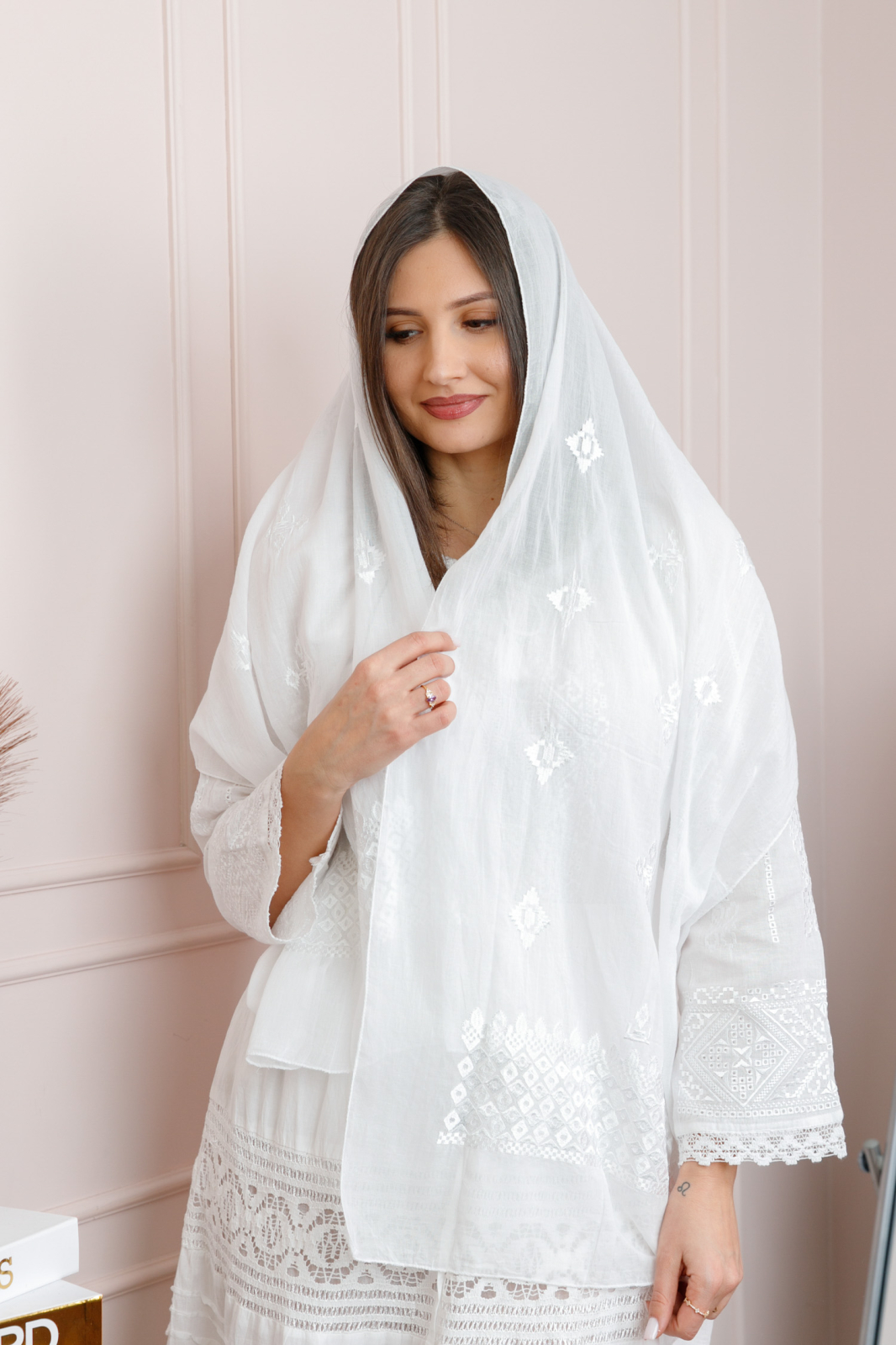 Marama traditionala alba din bumbac cu broderie alba cusuta cu fir de matase, ideala pentru a fi purtata si pe post de esarfa sau sal.