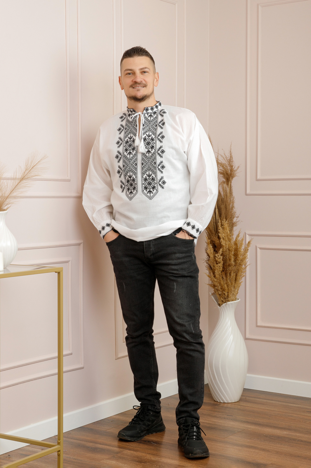 Camasa barbateasca traditionala alba cu motiv geometric negru Vlad