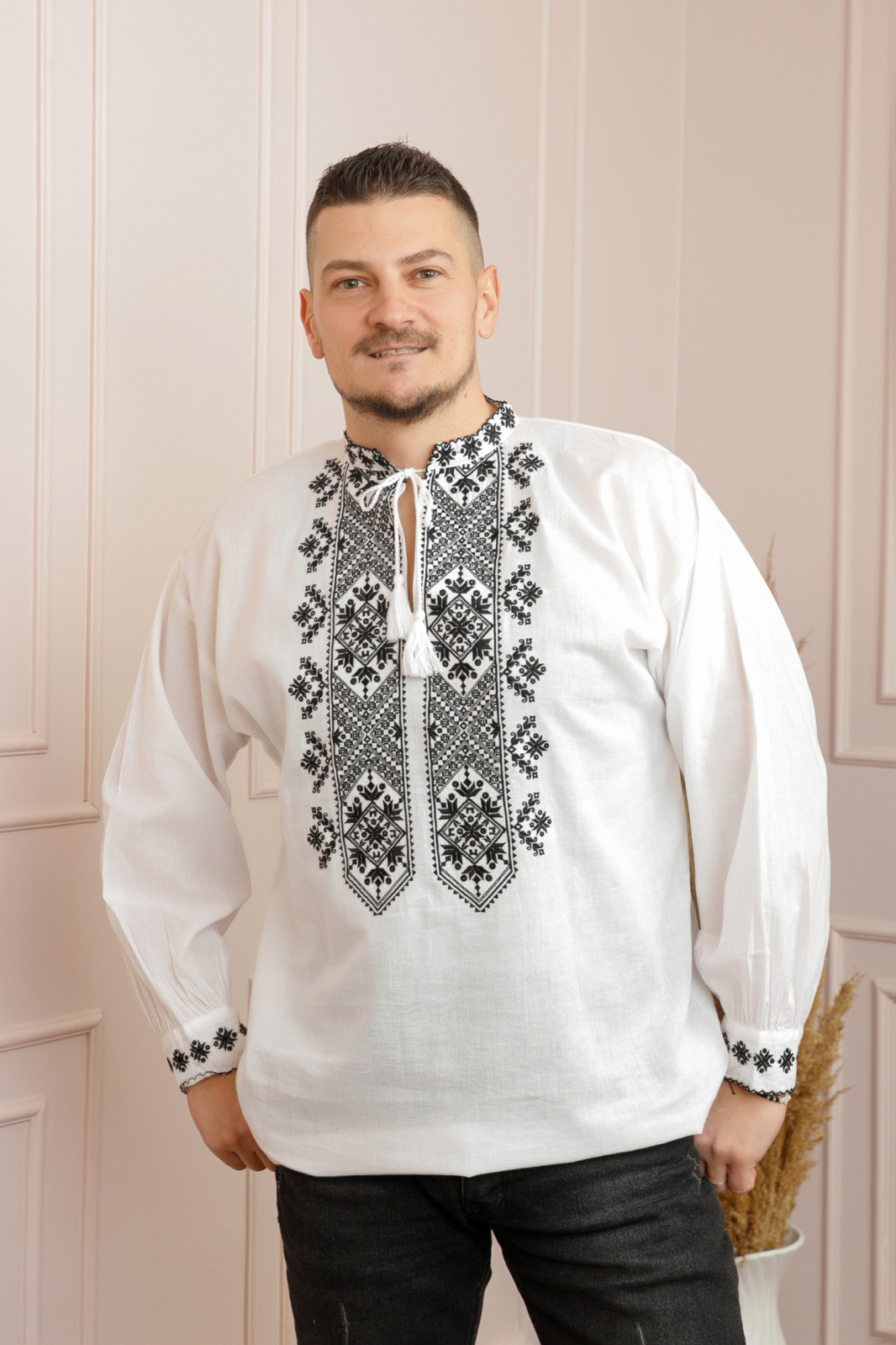 Camasa barbateasca traditionala alba din bumbac cu maneca lunga si motiv traditional negru
