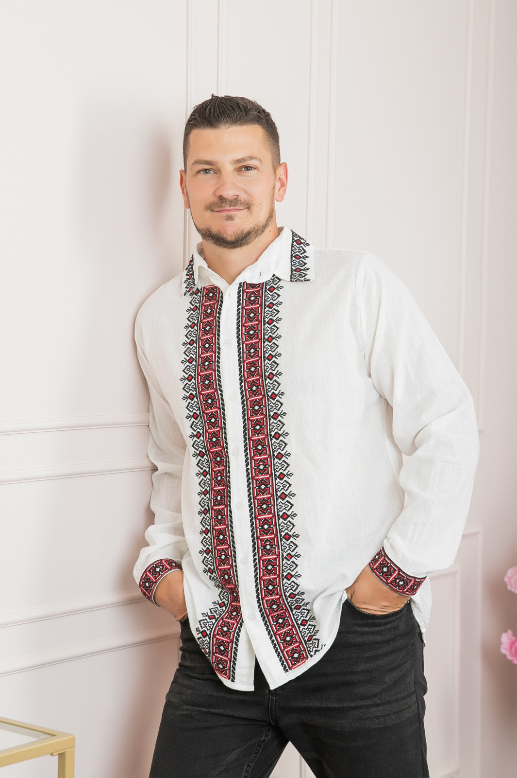 Camasa barbateasca traditionala alba cu motiv geometric rosu Razvan 01