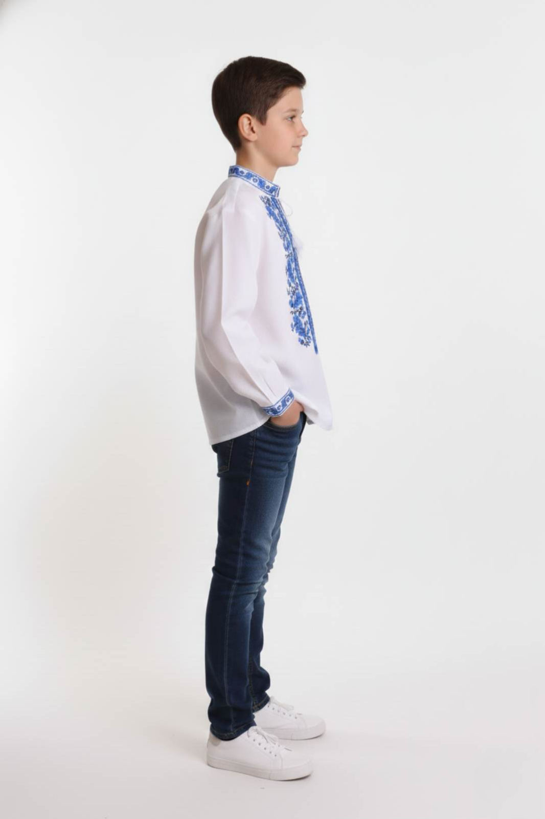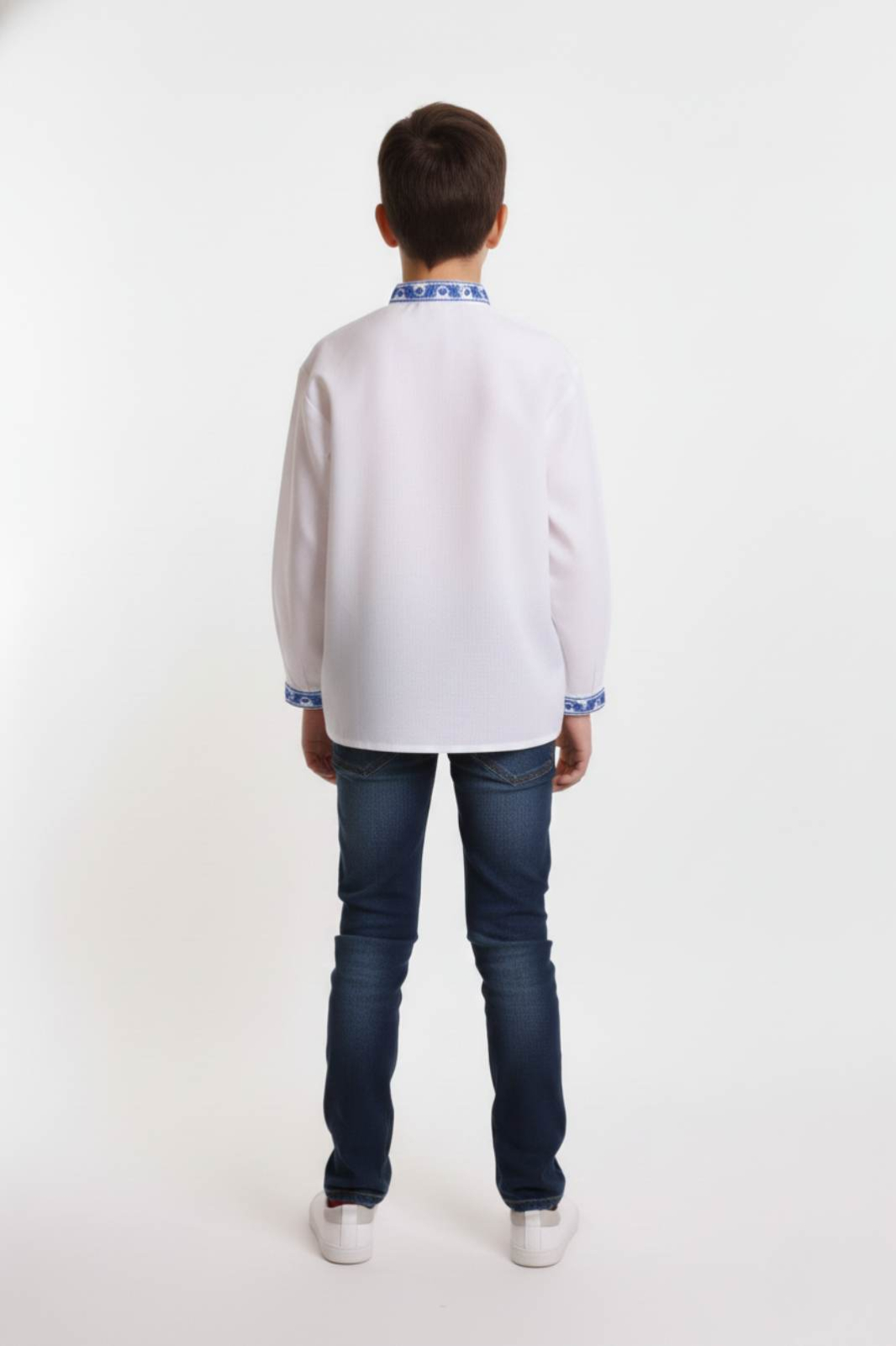Camasa traditionala de baieti alba din bumbac cu maneca lunga si motiv traditional albastru