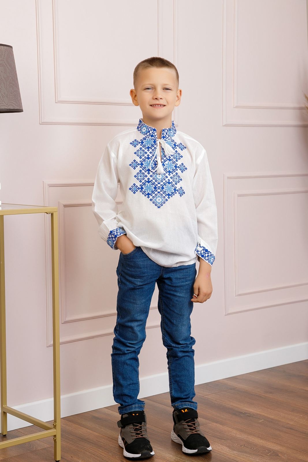 Camasa traditionala de baieti alba cu motiv geometric albastru Filip 02