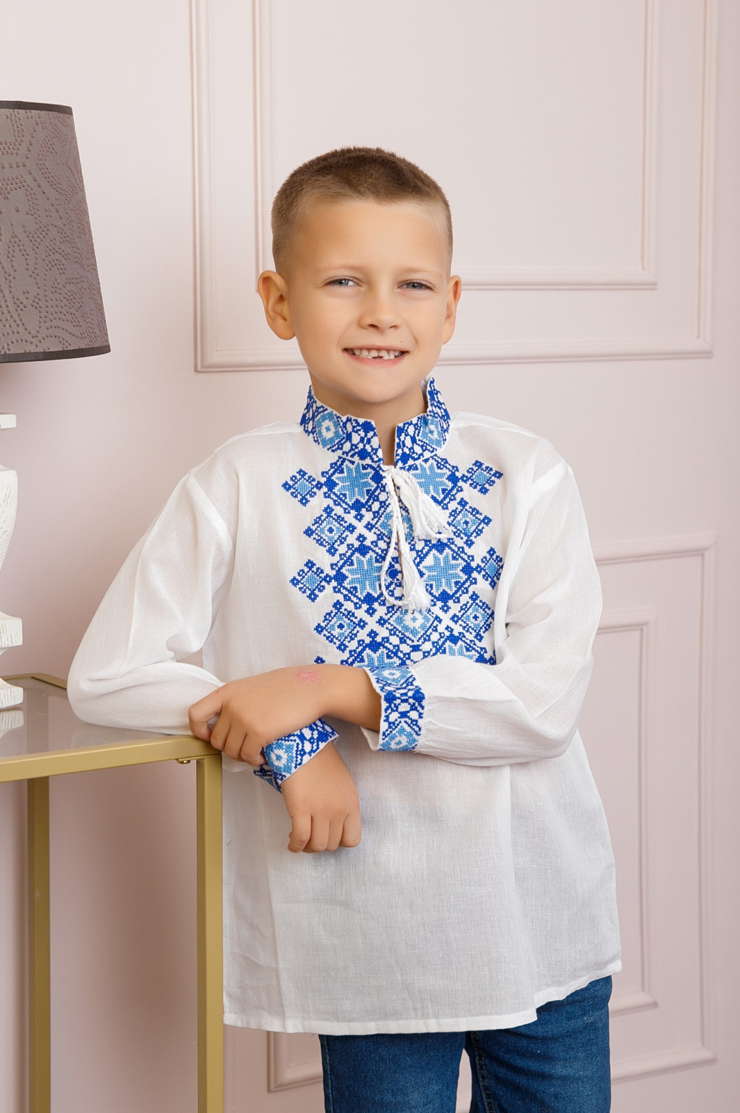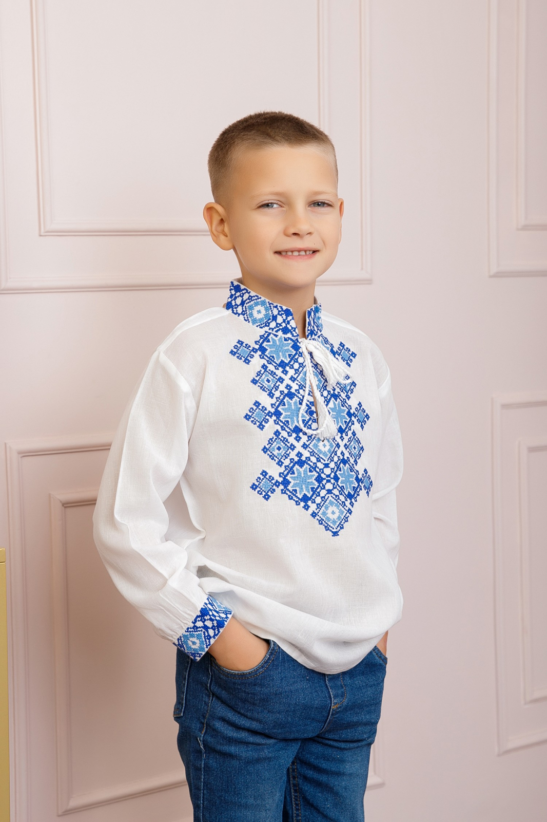 Camasa traditionala de baieti alba din bumbac cu maneca lunga si motiv traditional albastru