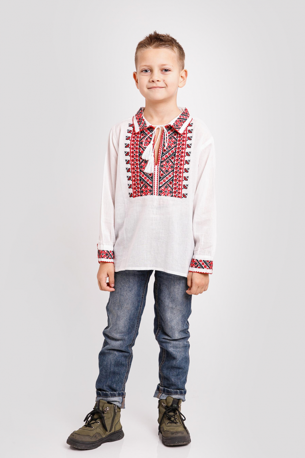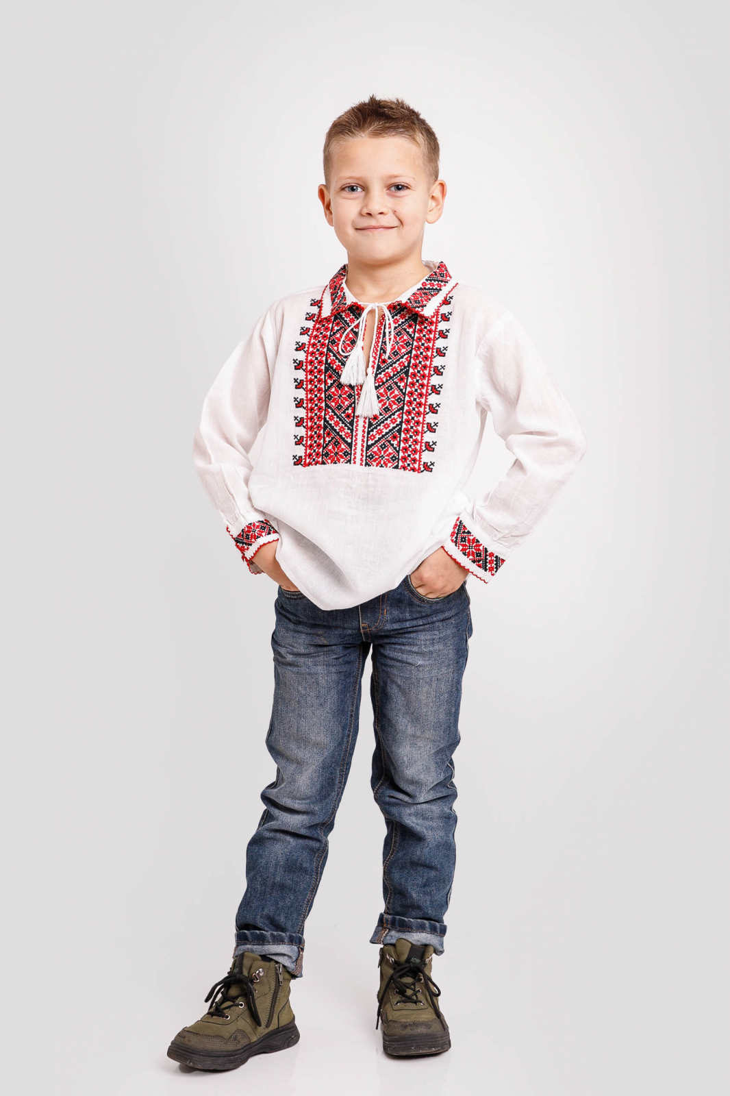 Camasa traditionala alba din bumbac cu maneca lunga si motiv traditional rosu