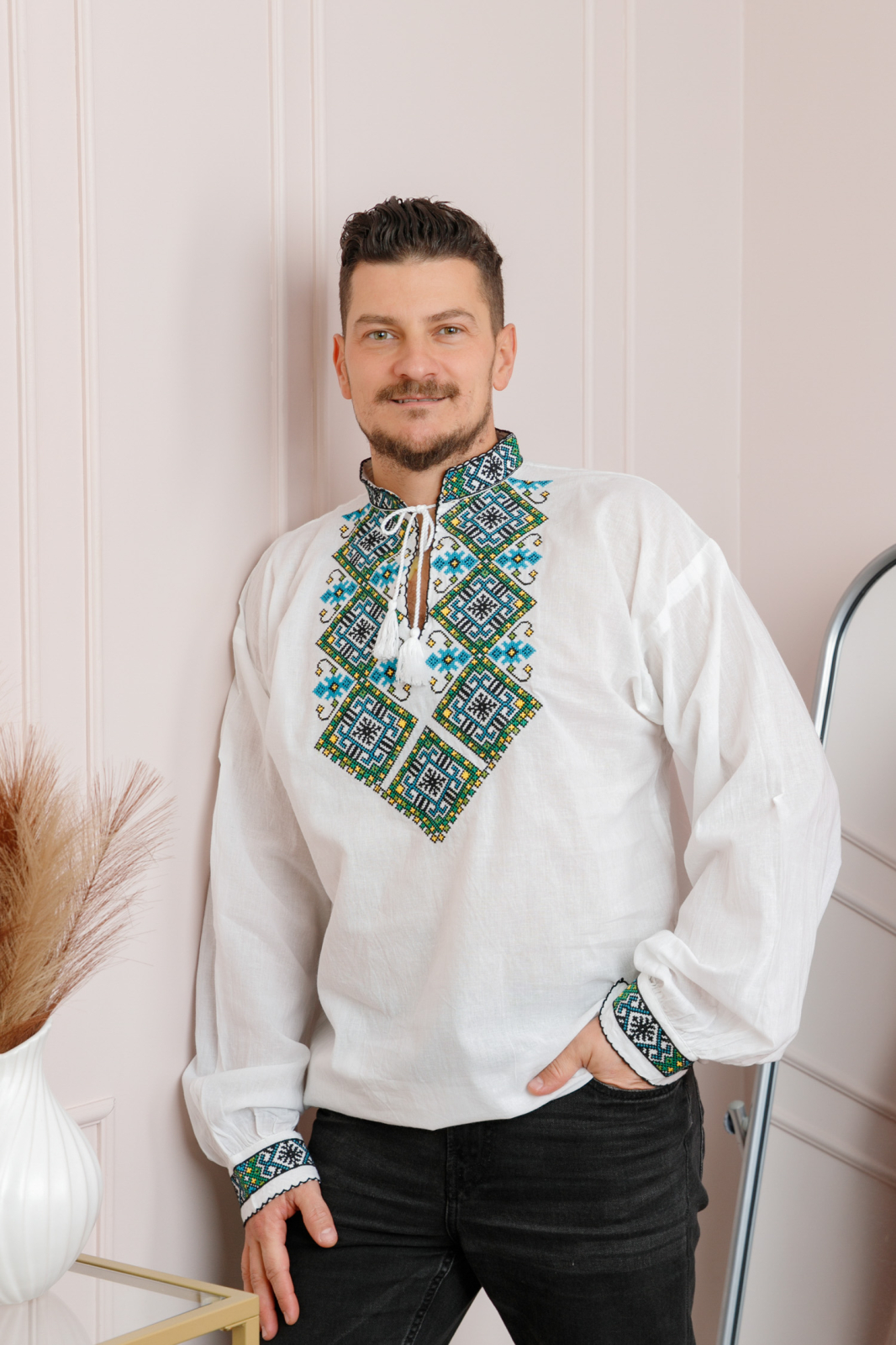 Camasa barbateasca stil ie, realizata din bumbac alb usor si respirabil, cu broderie geometrica turcoaz pe piept, guler si mansete. Croiala lejera ofera confort si libertate de miscare, iar broderia computerizata asigura un aspect uniform si rezistenta in timp. Versatila si usor de integrat in tinute casual sau smart-casual, este potrivita pentru evenimente tematice, iesiri in oras sau purtare zilnica alaturi de blugi ori pantaloni clasici.