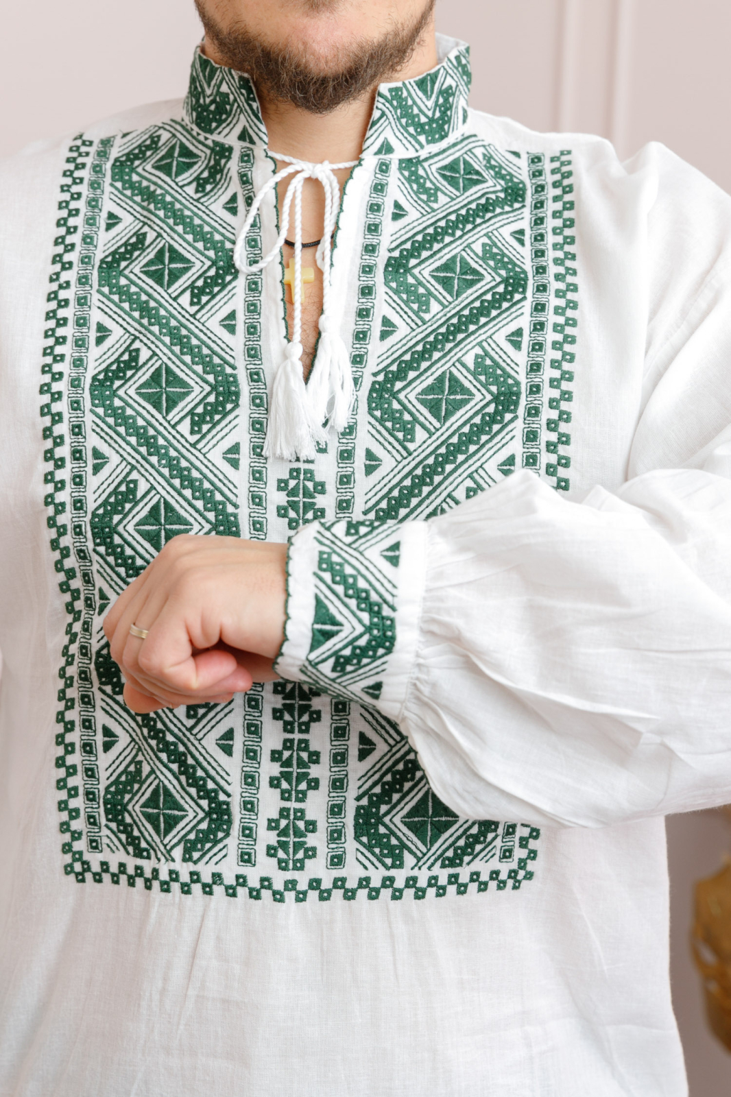 Camasa barbateasca stil ie, realizata din bumbac alb usor si respirabil, cu broderie geometrica verde pe piept, guler si mansete. Croiala lejera ofera confort si libertate de miscare, iar broderia computerizata asigura un aspect uniform si rezistenta in timp. Versatila si usor de integrat in tinute casual sau smart-casual, este potrivita pentru evenimente tematice, iesiri in oras sau purtare zilnica alaturi de blugi ori pantaloni clasici.