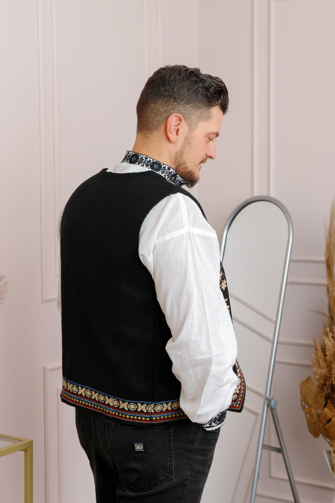 Vesta traditionala neagra din stofa cu motiv floral auriu. Modelul de vesta ofera lejeritate la purtare, intrucat nu prezinta inchidere.