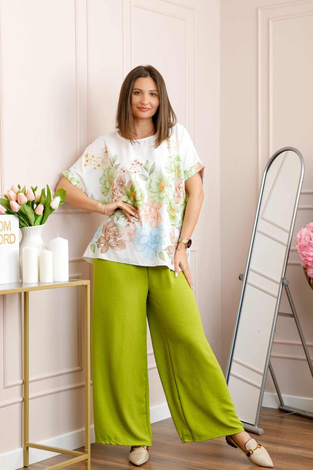 Compleul Deborah este alegerea ideala pentru tinute moderne si feminine, combinand confortul unui croi lejer cu un design elegant si versatil. Bluza vaporoasa, cu imprimeu floral delicat, completeaza perfect pantalonii largi, oferind un look echilibrat si usor de purtat in orice moment al zilei.