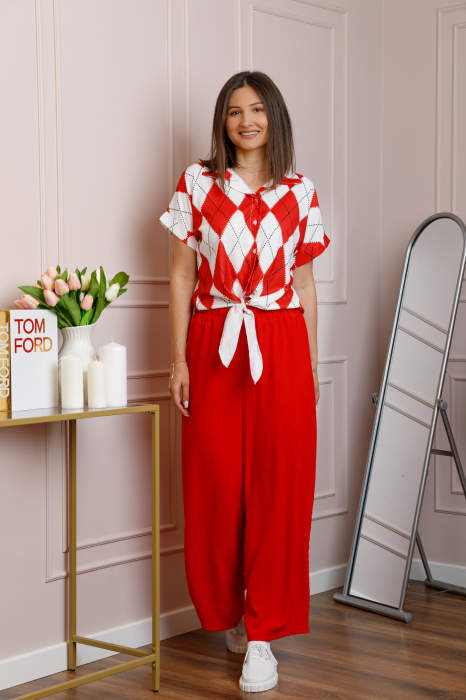 Setul este compus din bluza cu imprimeu geometric in nuante de rosu si alb si pantaloni intr-o nuanta intensa de rosu, creand un contrast echilibrat si un look fresh, usor de integrat in tinute de zi sau aparitii casual-chic.
