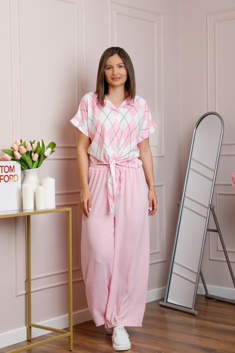 Setul este compus din bluza cu imprimeu geometric in nuante de roz pastel si alb si pantaloni roz pastel, creand un contrast echilibrat si un look fresh, usor de integrat in tinute de zi sau aparitii casual-chic.