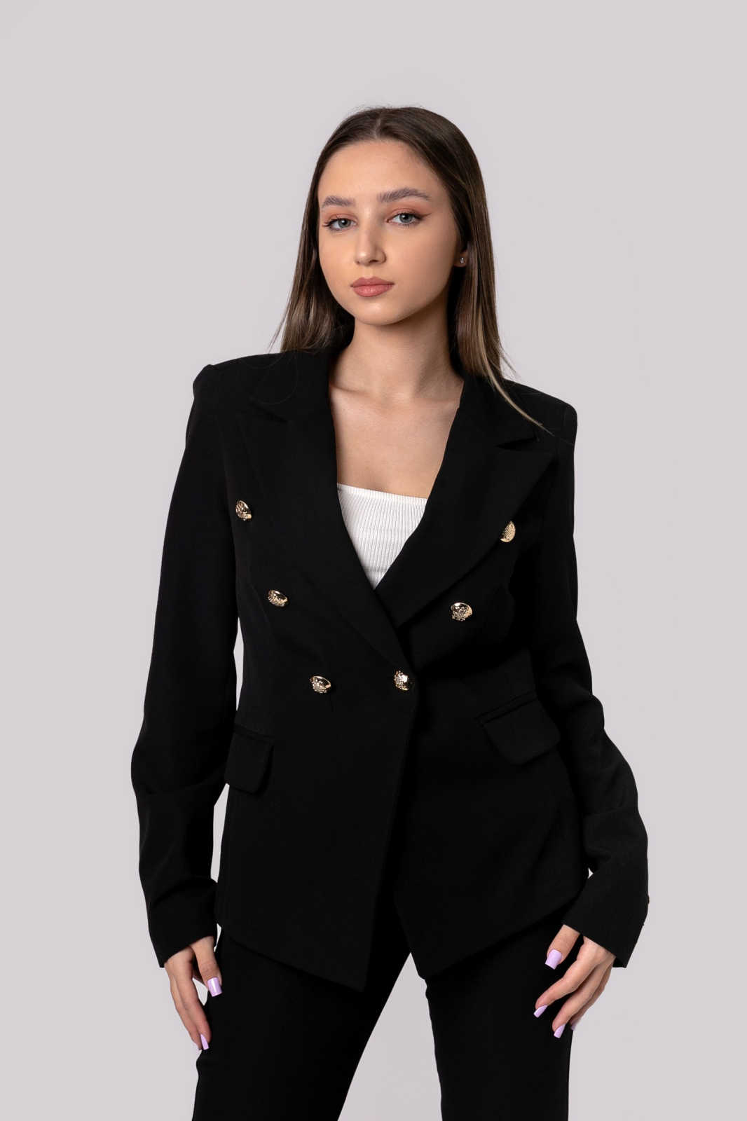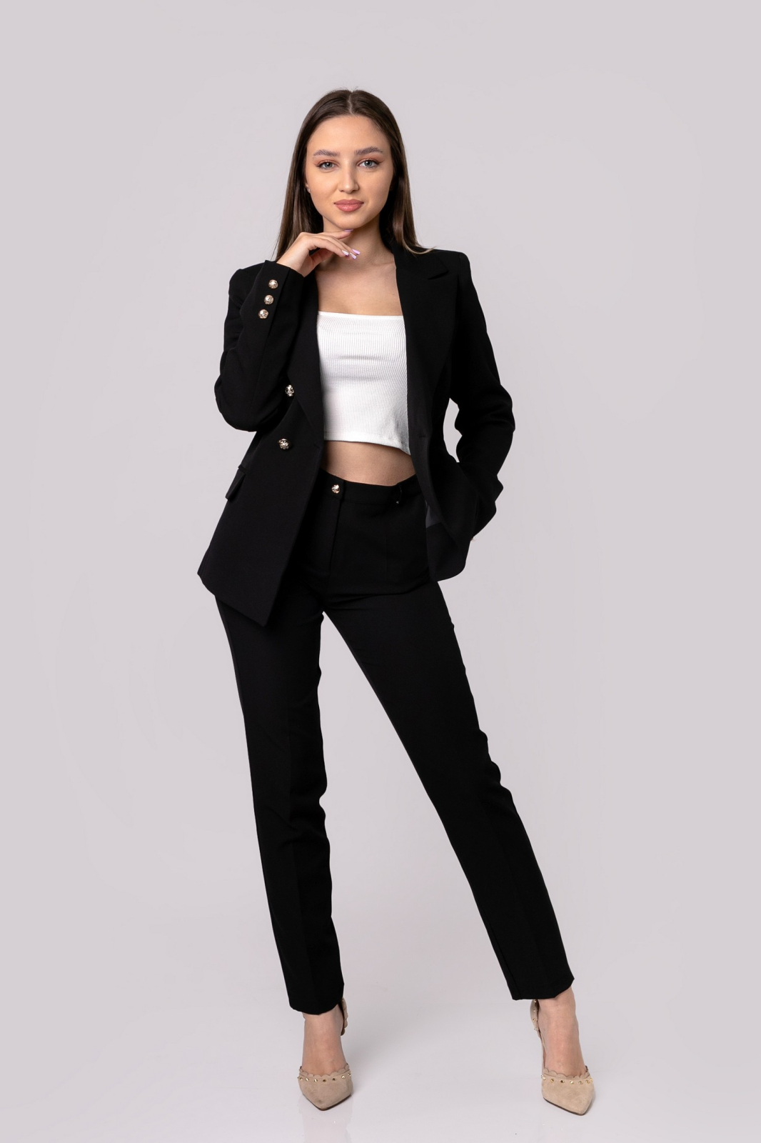 Compleu office compus din sacou si pantaloni. Sacoul are maneci lungi, rever clasic si buzunare decorative. Prezinta croi cambrat si inchidere cu nasturi. Pantalonii cu dunga au talie inalta, croi conic, buzunare laterale functionale si inchidere clasica cu nasture si fermoar.
