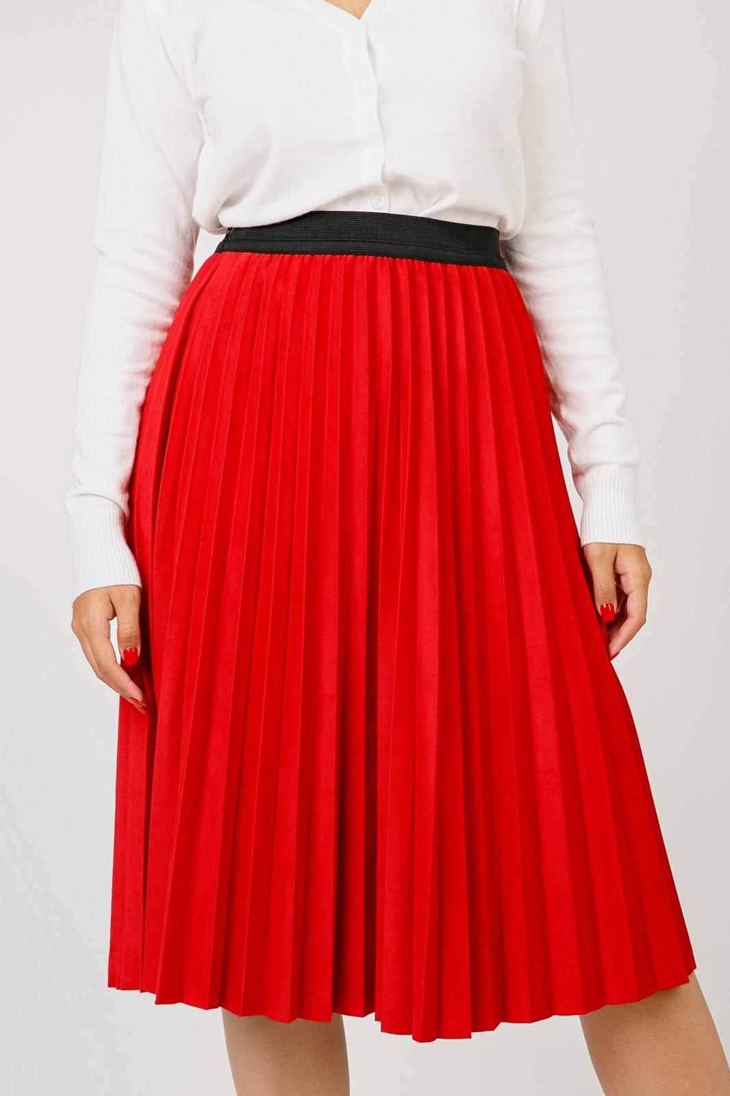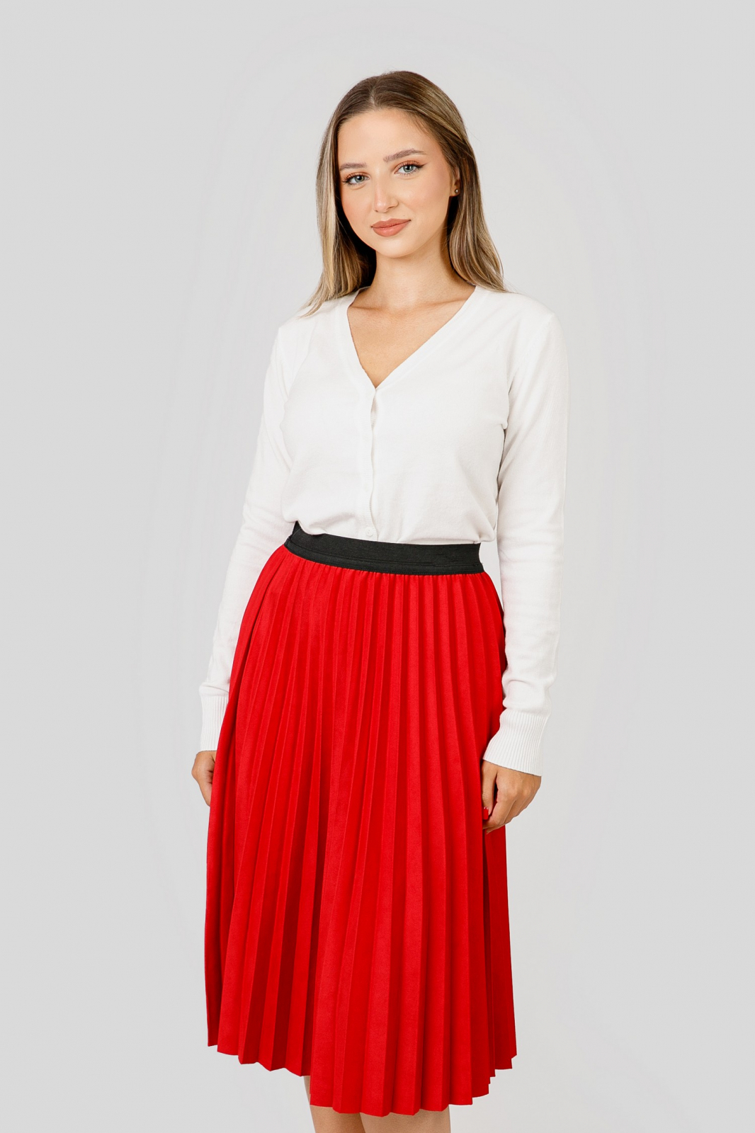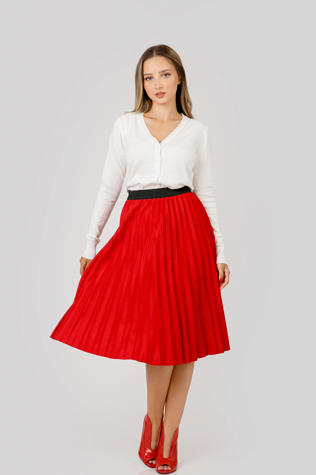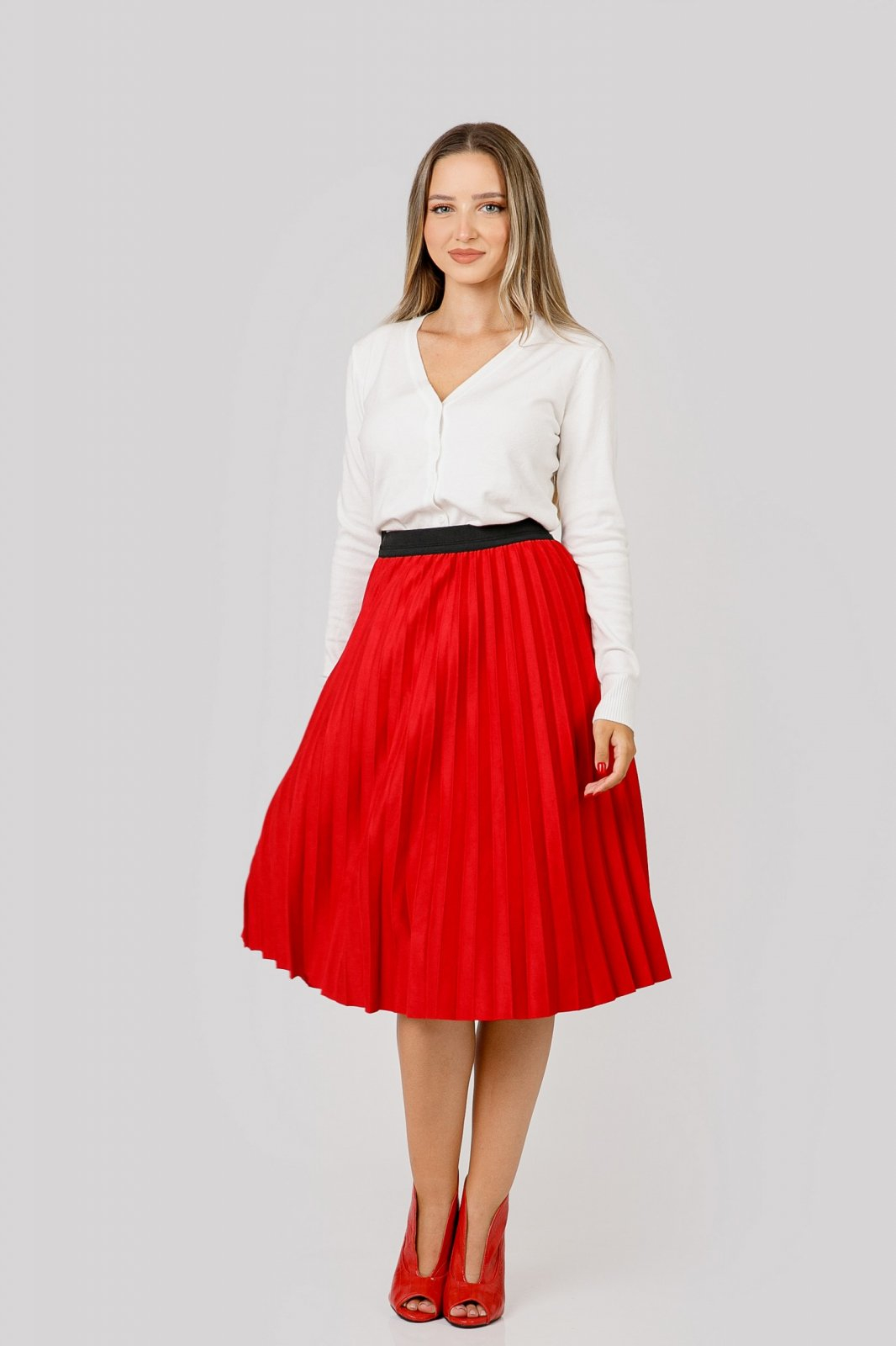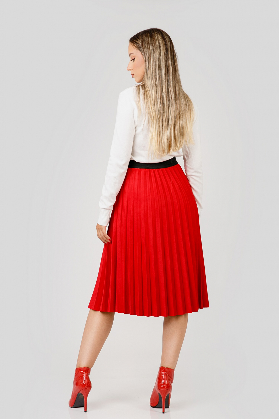 Fusta rosie cu croi plisat, talie inalta si elastic in talie. Betelia este elastica si acomodeaza mai multe marimi. Nu se sifoneaza, nu necesita calcare.