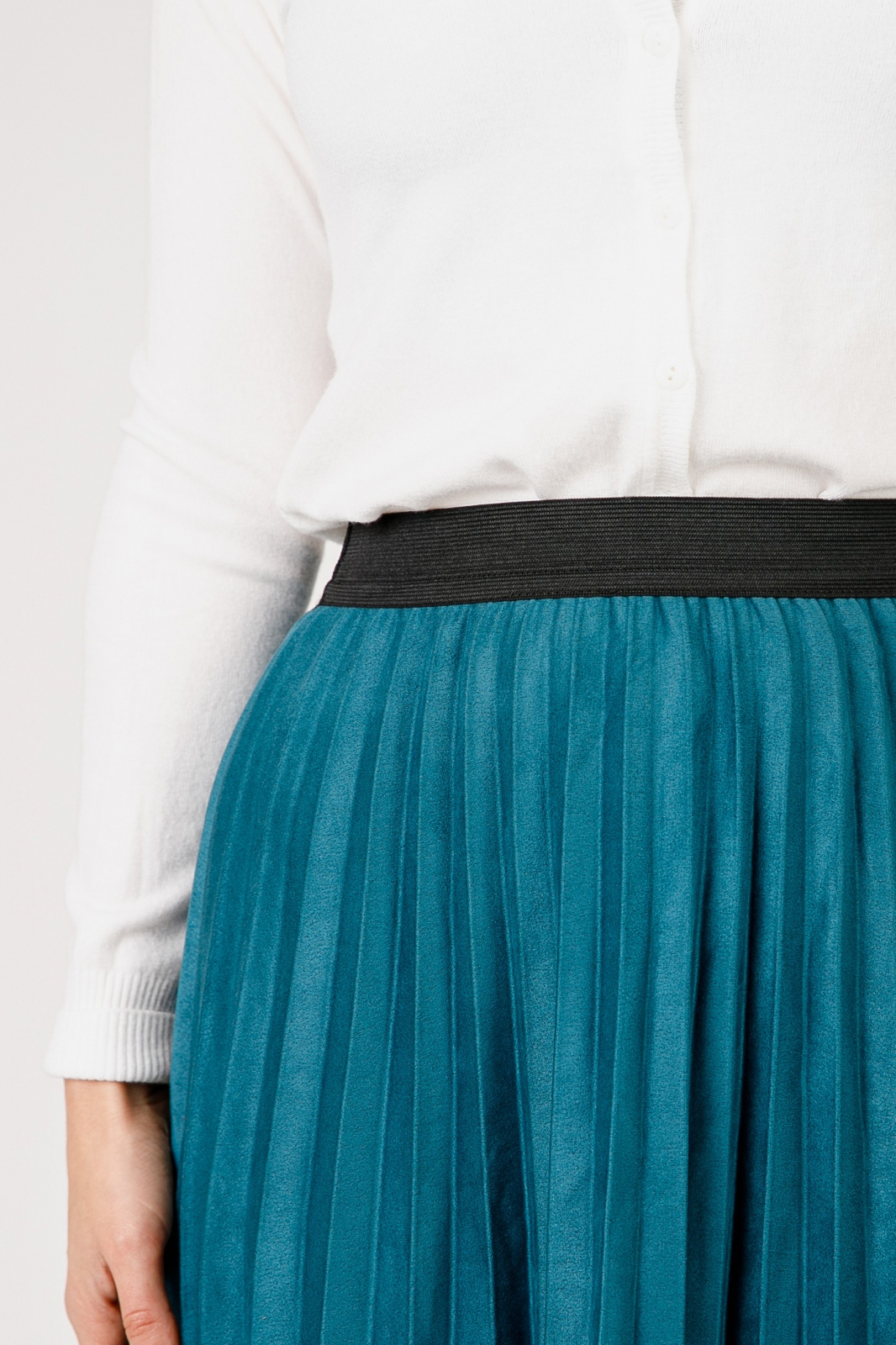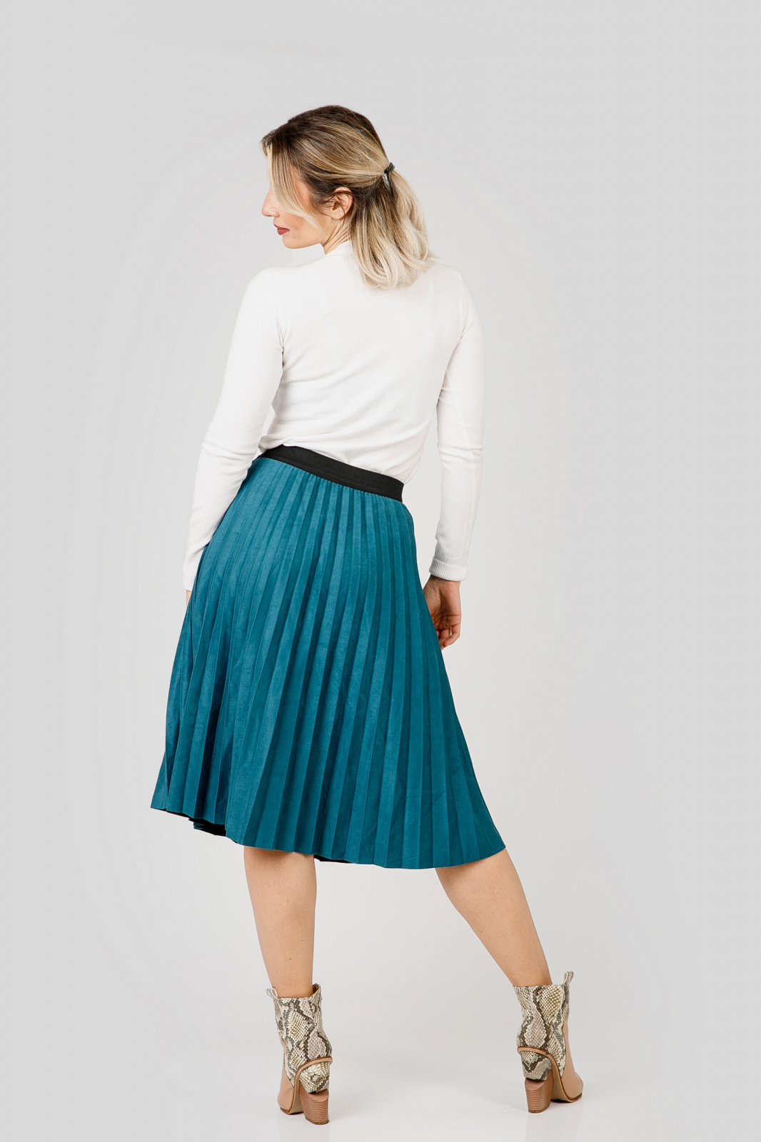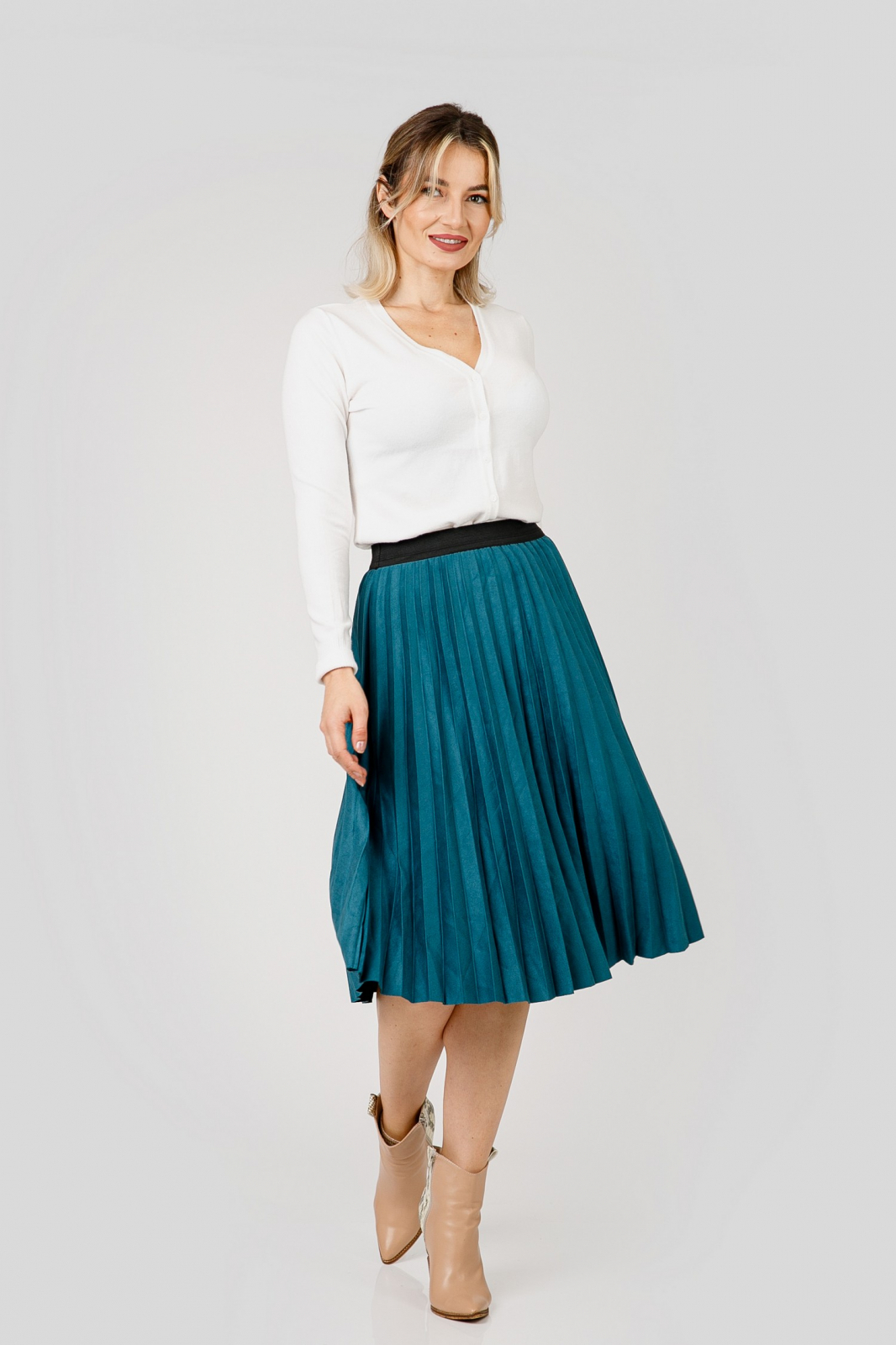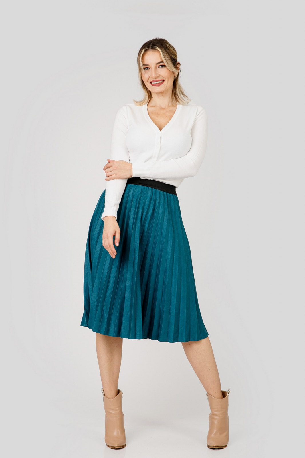 Fusta turcoaz cu croi plisat, talie inalta si elastic in talie. Betelia este elastica si acomodeaza mai multe marimi. Nu se sifoneaza, nu necesita calcare.