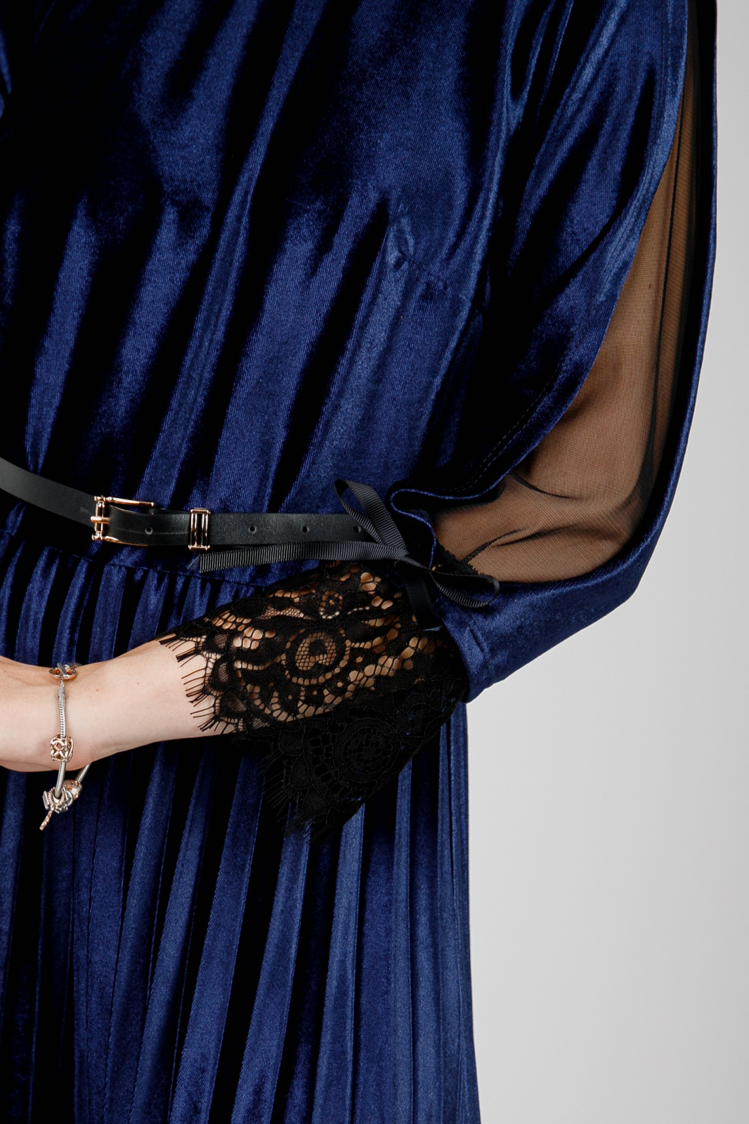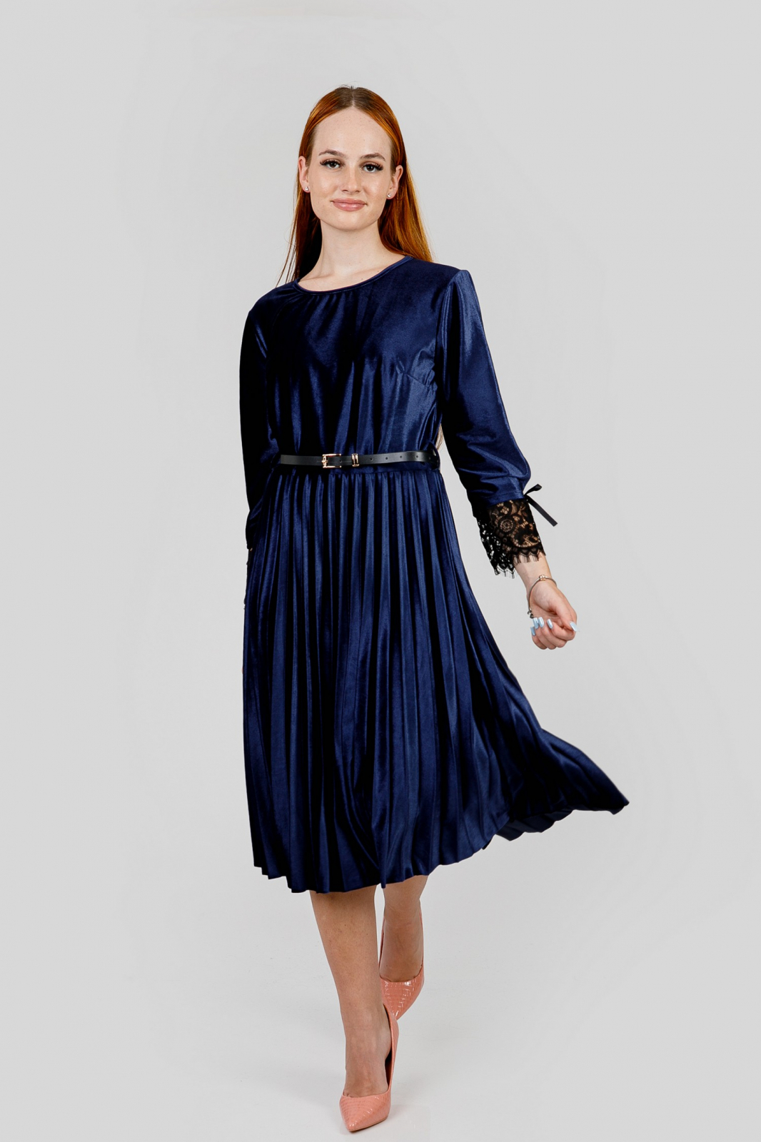 Rochie bleumarin cu curea in talie si croi clos. Are fusta plisata, guler rotund si maneci trei sferturi cu decupaj lateral si insertie de dantela la baza. Rochia este din catifea opaca, plina, care pica greu si nu necesita dublura la interior.