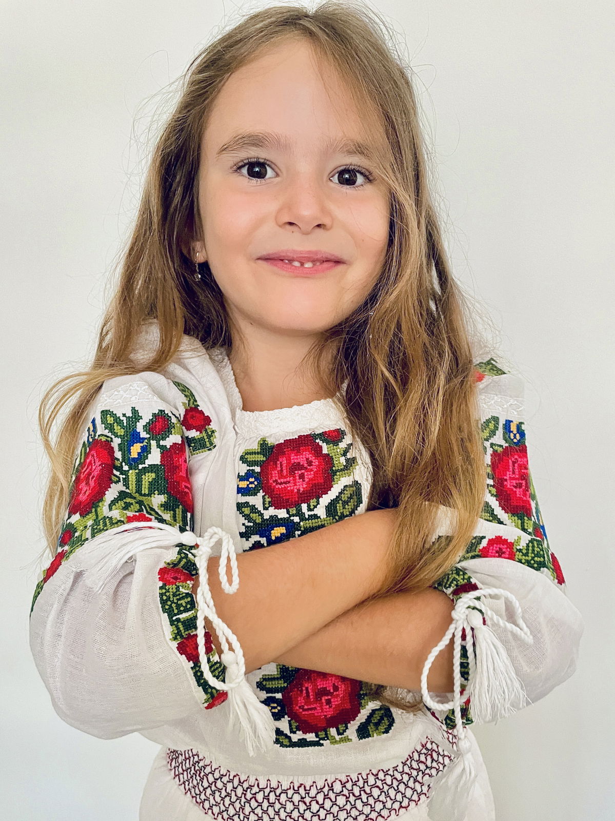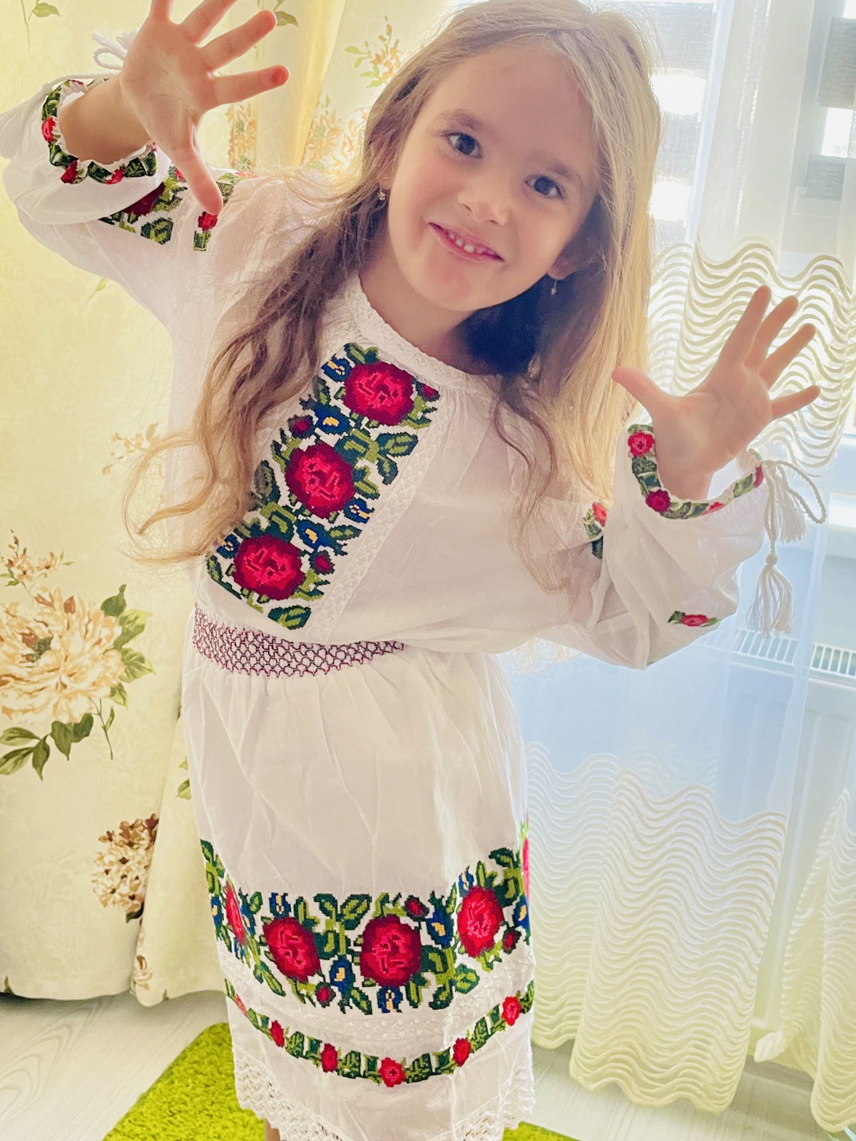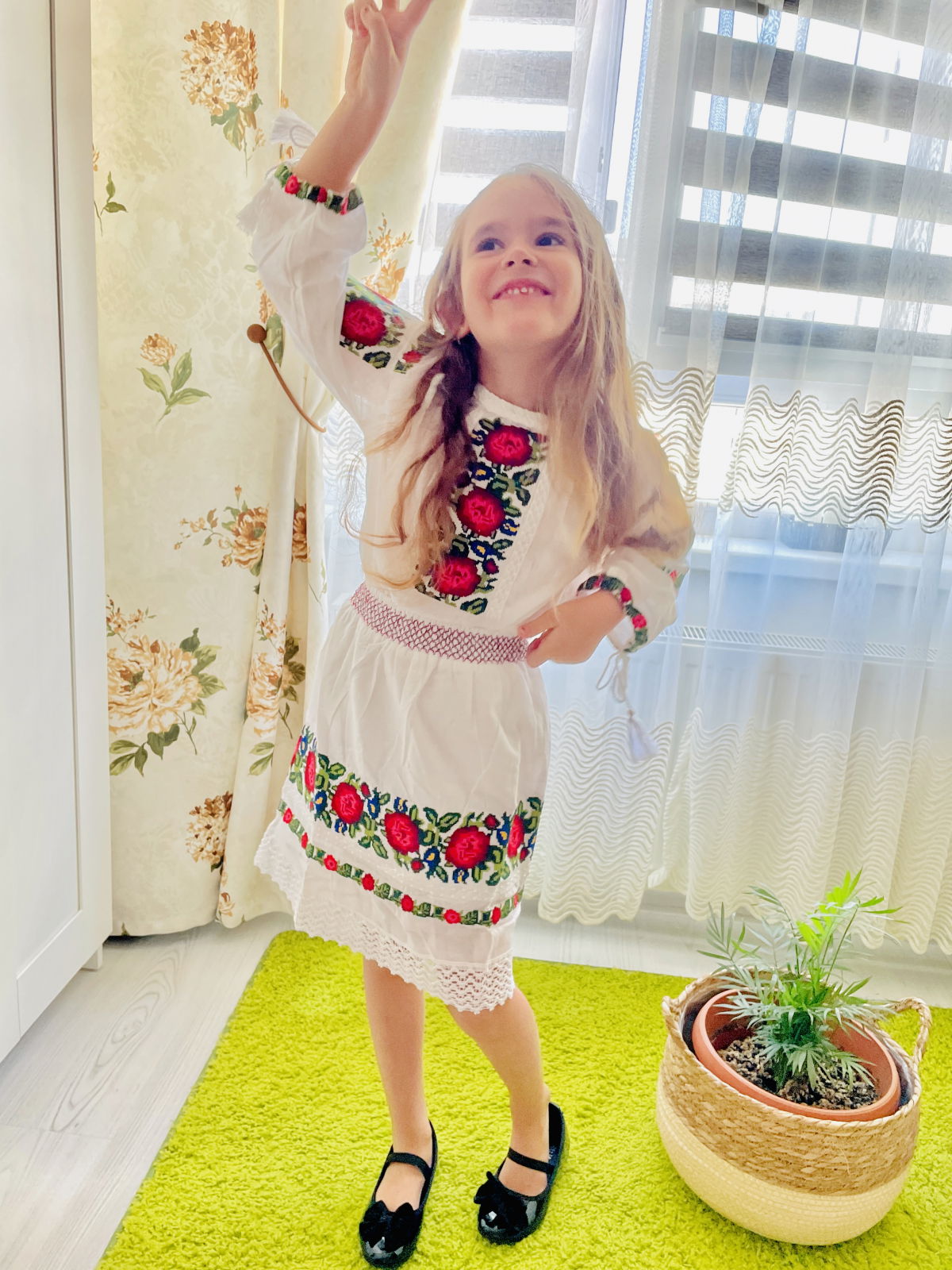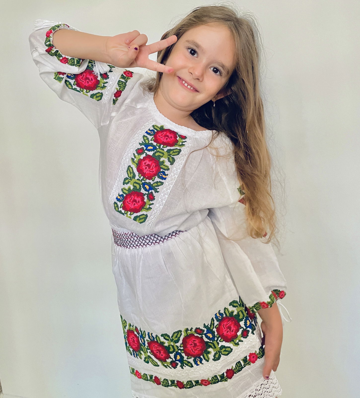Compleu traditional alb pentru fetite cu motiv floral rosu Emma