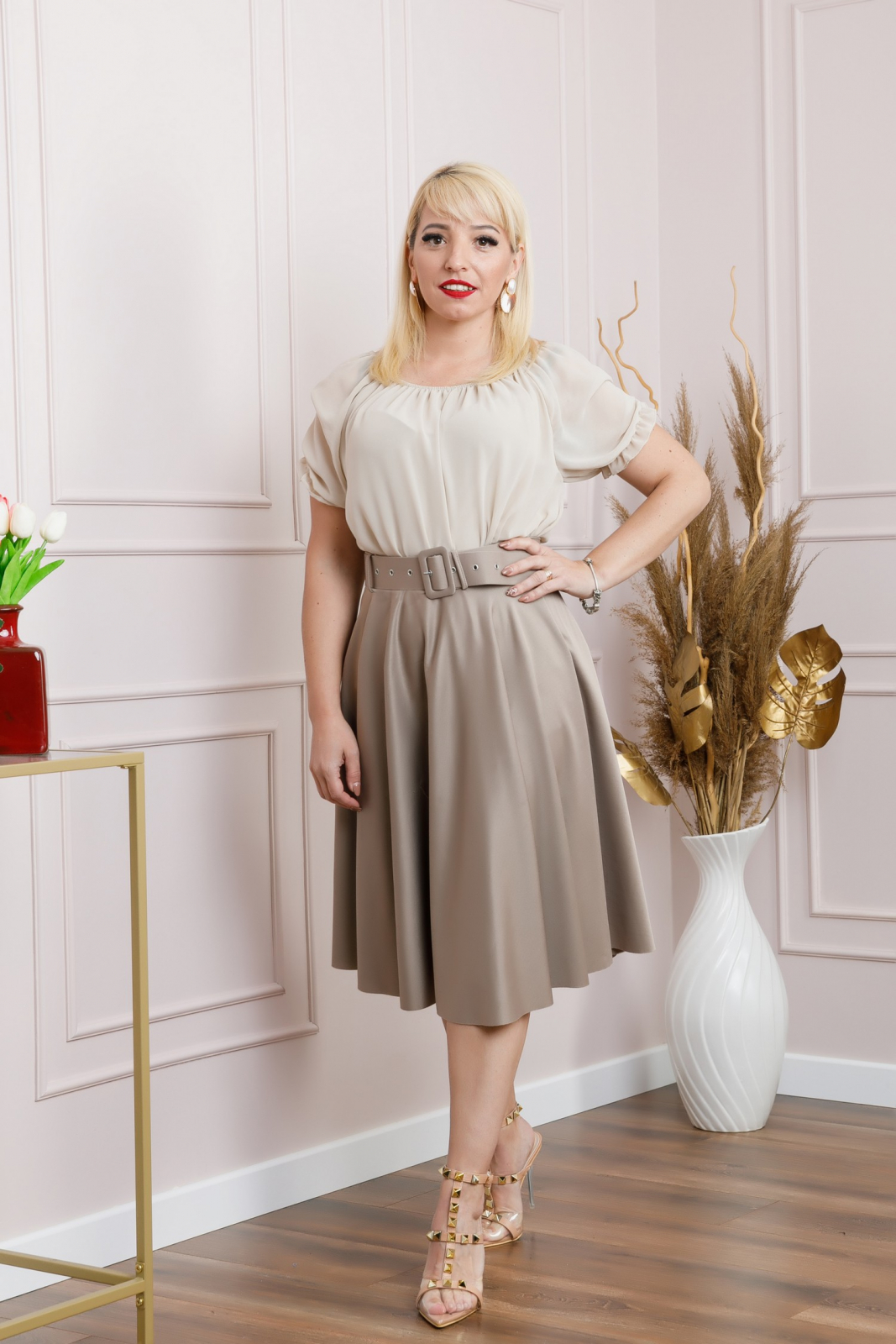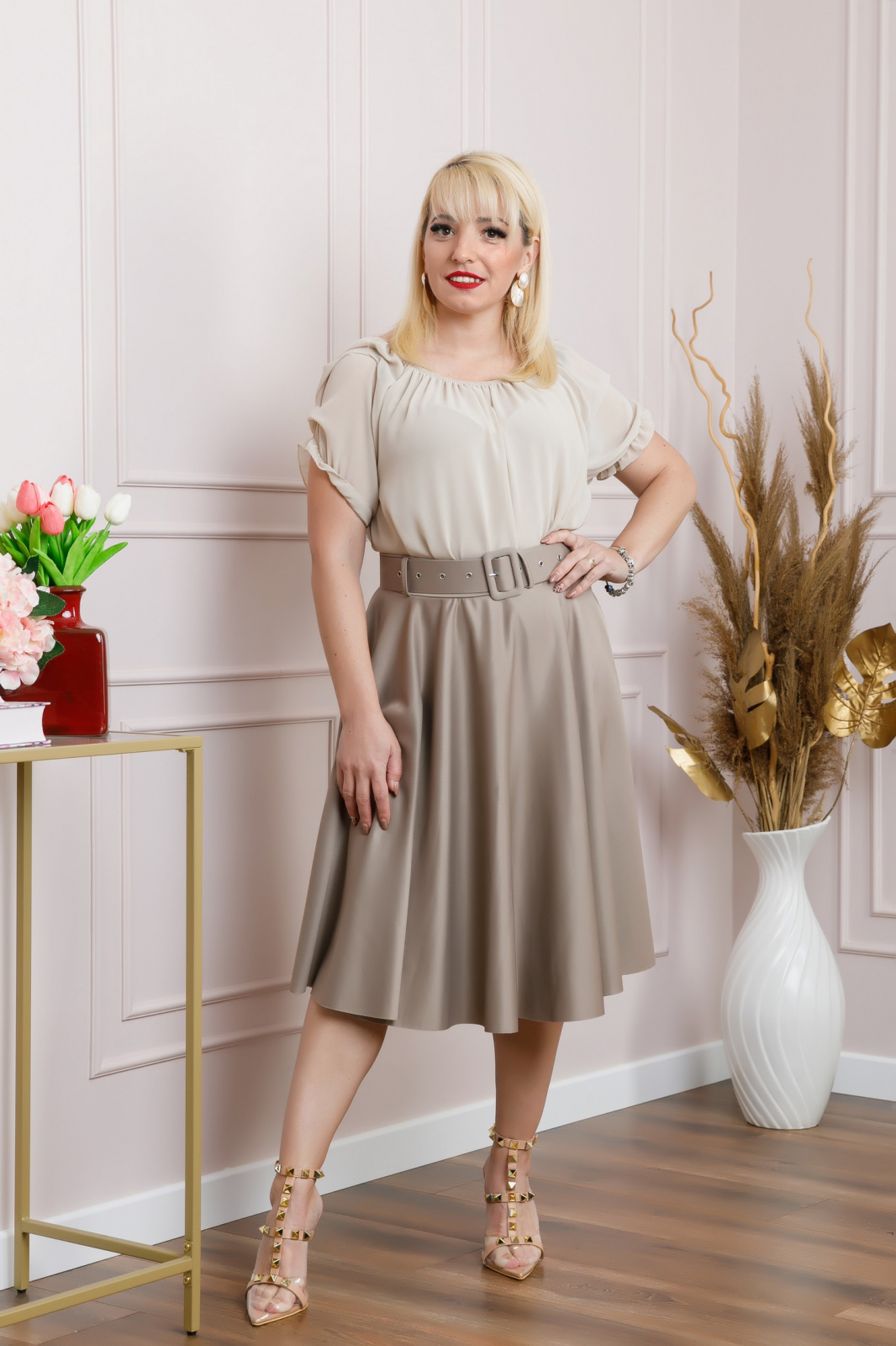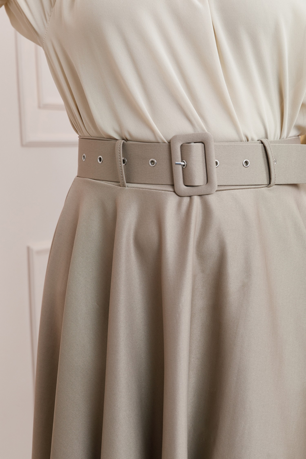 Fusta gri din material moale si fin. Are croi clos, talie inalta si curea in talie. Betelia este elastica si acomodeaza mai multe marimi.