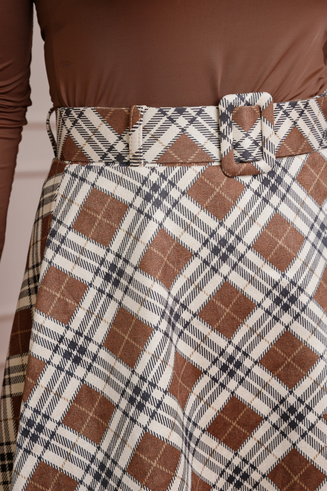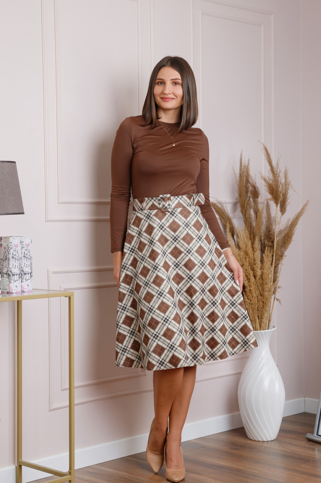 Fusta eleganta si versatila, perfecta pentru a adauga un plus de stil tinutelor tale de zi cu zi. Fabricata din piele intoarsa sintetica, aceasta fusta combina aspectul rafinat cu un confort sporit. Croiala in clos ofera libertate de miscare, in timp ce centura din talie accentueaza silueta si adauga un detaliu functional. Betelia este elastica si acomodeaza mai multe marimi. Nu se sifoneaza, nu necesita calcare. Carourile in nuante de maro completeaza designul clasic, facand din aceasta fusta o piesa usor de integrat in orice garderoba.