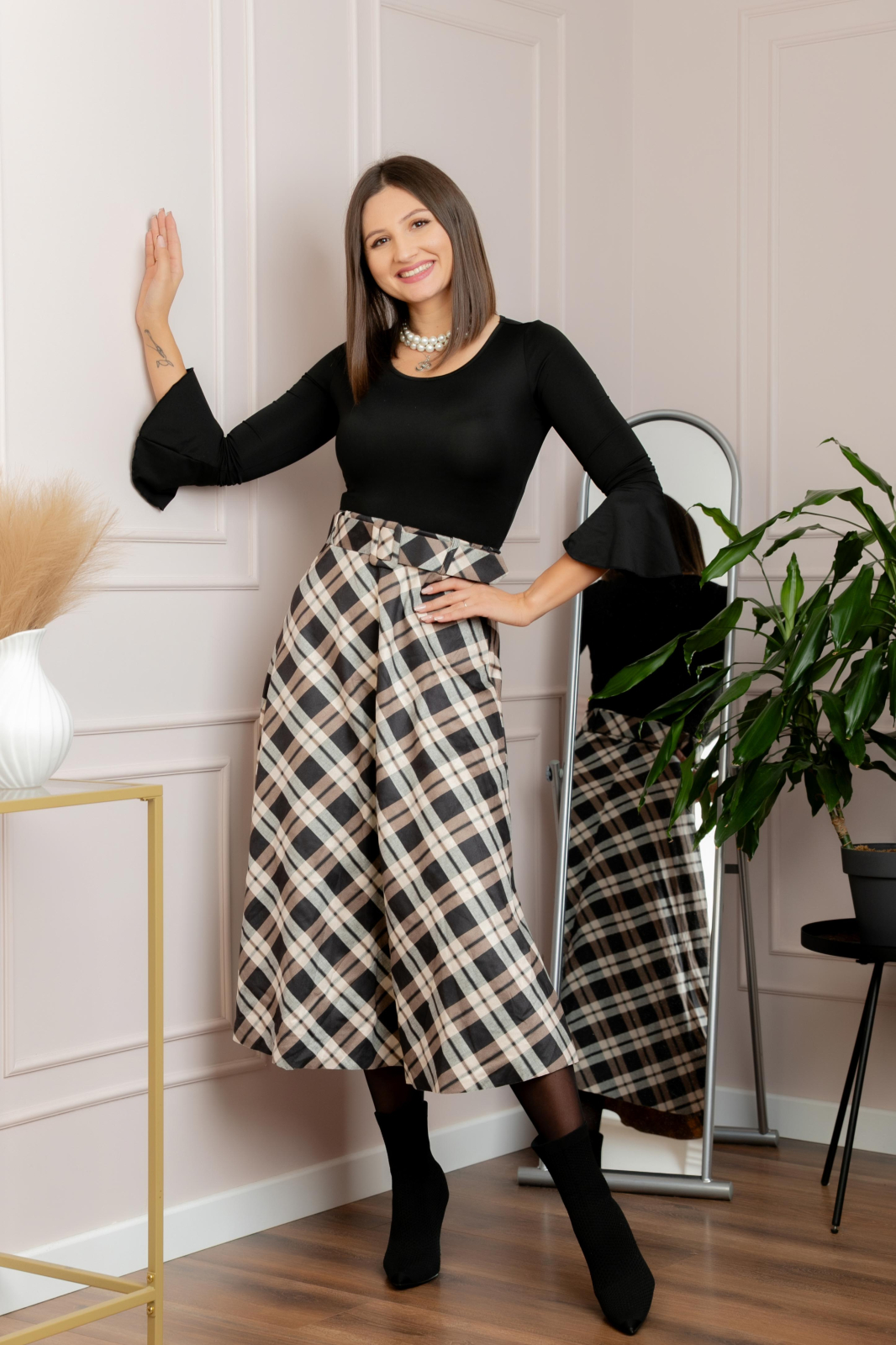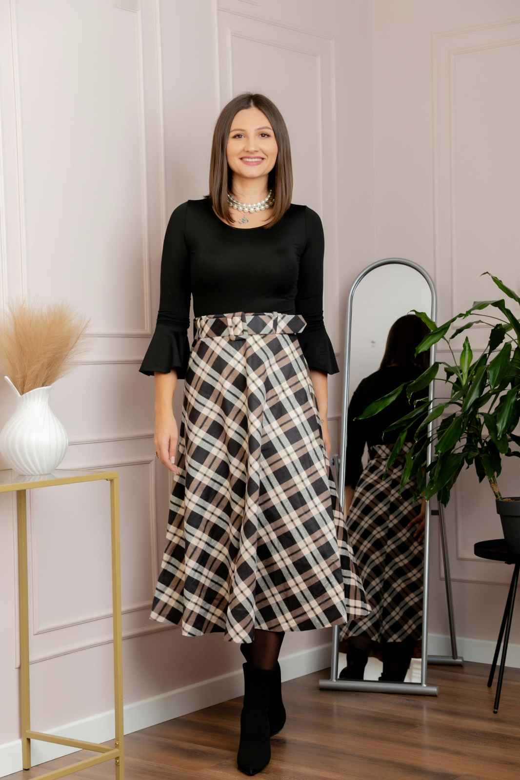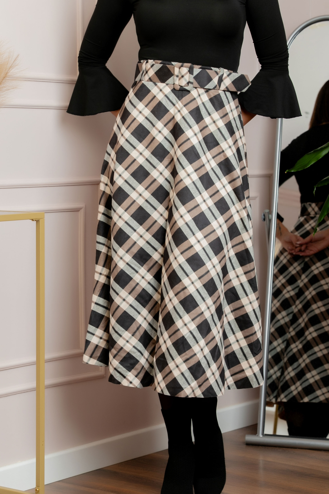 Fusta lunga Sabrina imbina eleganta clasica a imprimeului ecosez cu rafinamentul texturii din piele intoarsa ecologica. Croiul amplu si centura lata in talie evidentiaza frumos silueta, oferind o tinuta feminina si moderna, potrivita pentru birou sau iesiri de zi.